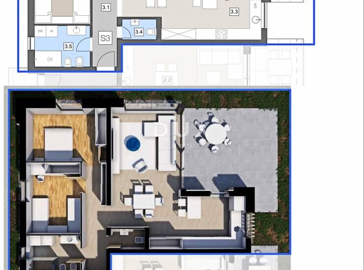 Sastoji se od dvije spavaće sobe, kupaonice, gostinjskog toaleta, hodnika i prostora otvorenog koncepta koji ujedinjuje dnevni boravak, blagovaonicu i kuhinju s izlazom na natkrivenu terasu.