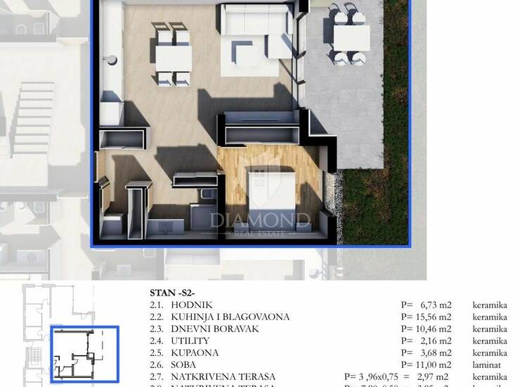 Stan se nalazi u prizemlju, ukupne površine 56.51m2 a sastoji se od: hodnika, blagovaonice i dnevnog boravka, kuhinje, kupaonice, spavaće sobe, ostave i natkrivene terase.