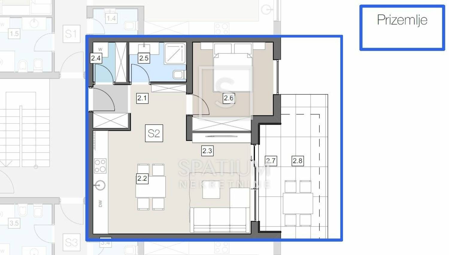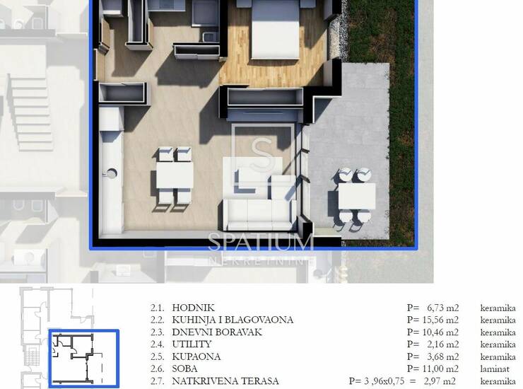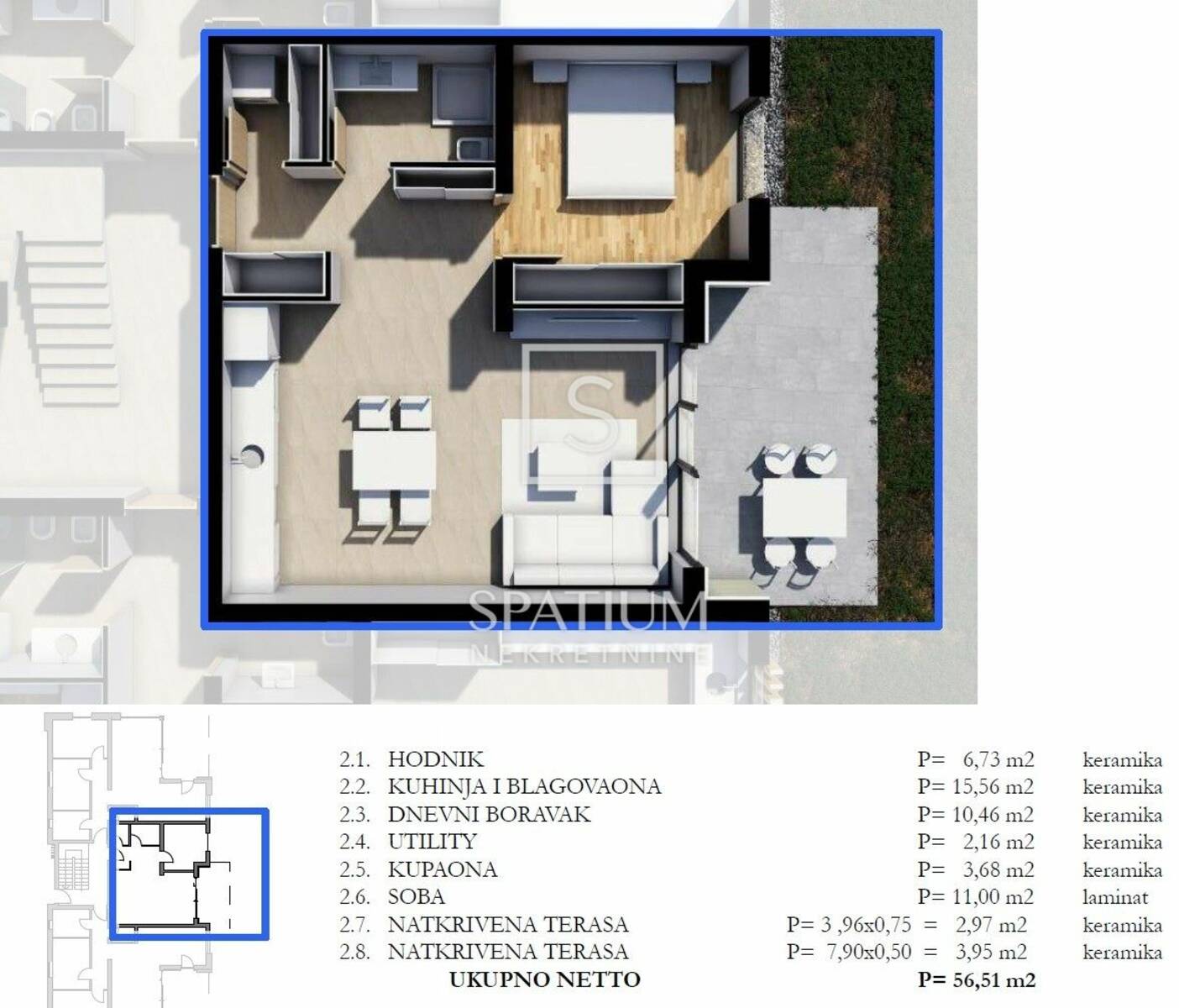 LABIN, u ponudu smo dobili moderan i prostran stan površine 56,51 m² smješten u prizemlju urbane vile vrhunske kvalitete, koja se sastoji od ukupno tri etaže. Stan je pomno osmišljen kako bi pružio maksimalnu udobnost i funkcionalnost te se sastoji od jedne spavaće sobe, kupaonice, hodnika te prostora otvorenog koncepta koji povezuje kuhinju, blagovaonicu i dnevni boravak s izlazom na natkrivenu terasu. Zahvaljujući velikim staklenim stijenama, prostor obiluje prirodnim svjetlom, stvarajući ugodnu atmosferu tijekom cijelog dana. Korišteni su trajni i kvalitetni materijali, a projekt je osmišljen tako da zadovolji visoke standarde modernog stanovanja. Planirani izgradnja je u lipnju 2027., dok je primopredaja predviđena za prosinac 2027.