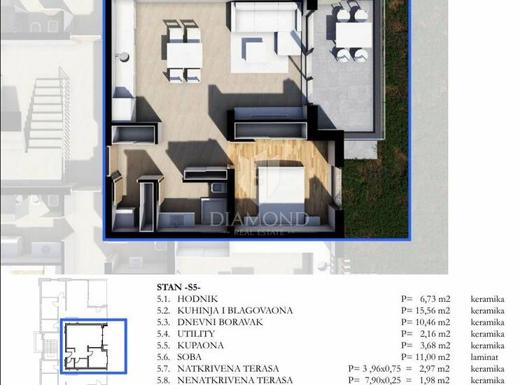 Stan se nalazi na prvom katu i sastoji se od: hodnika, kuhinje s blagovaonicom, dnevnog boravka, spremišta, kupaonice, spavaće sobe, natkrivene i nenatkrivene terase.