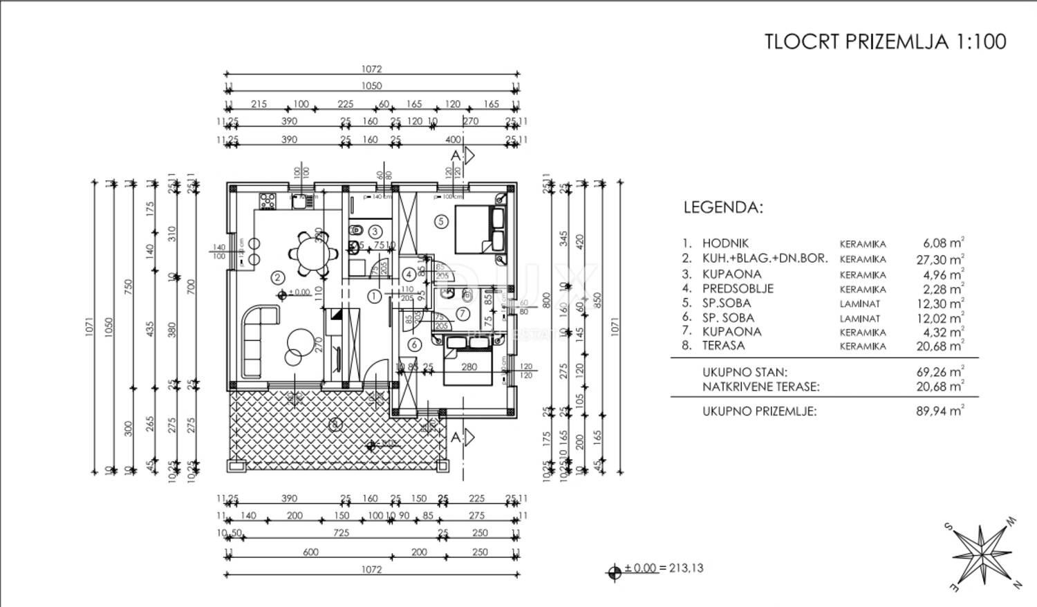 Građevinska dozvola se odnosi na građenje prizemnice koja se sastoji o hodnika, kuhinje sa blagovaonicom i dnevnim boravkom, predsoblja, dvije spavaće sobe, dvije kupaonice i natkrivene terase (20m2).