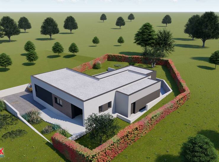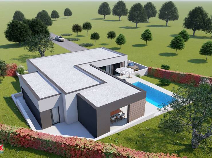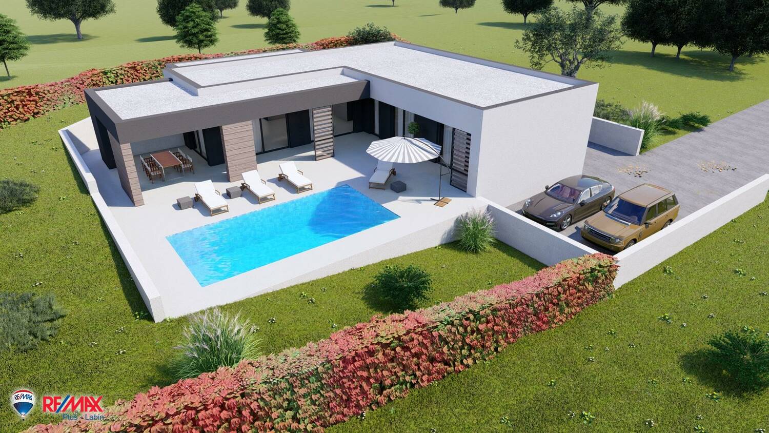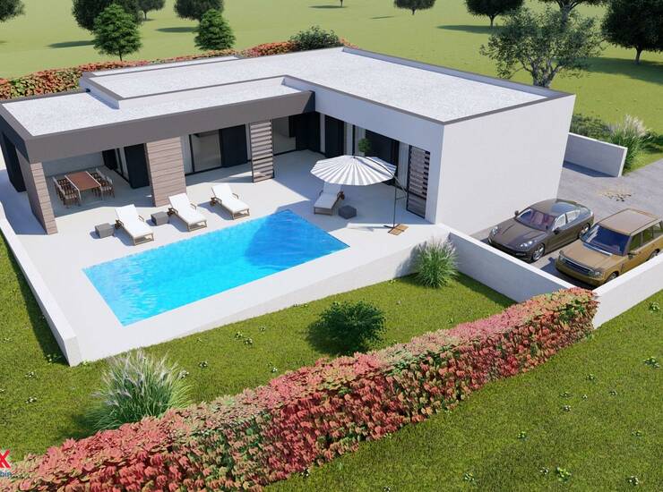 U ponudi je građevinsko zemljište s građevinskom dozvolom za izgradnju moderne prizemnice s bazenom. Projekt je osmišljen tako da pruža maksimalnu udobnost i funkcionalnost, idealno za obiteljski život ili kuću za odmor.