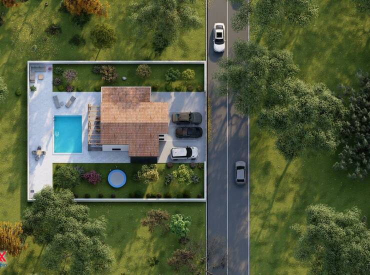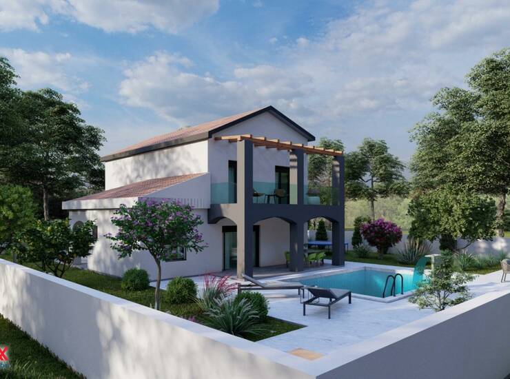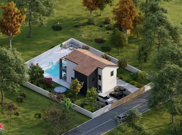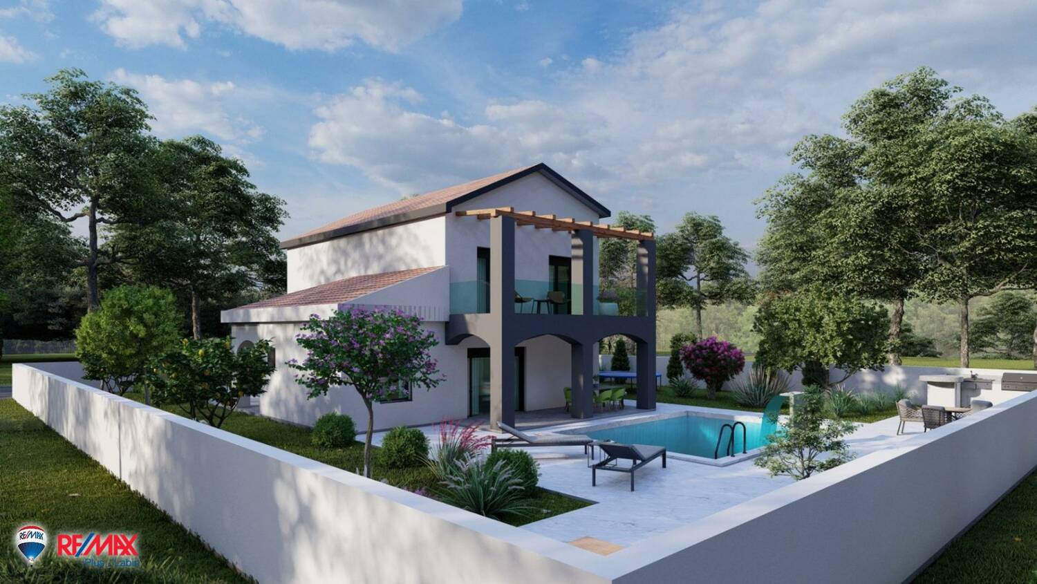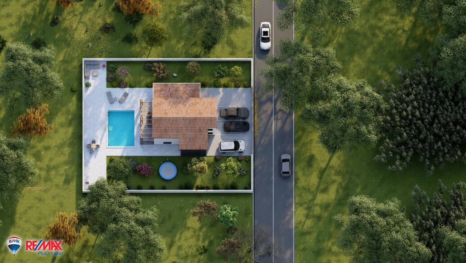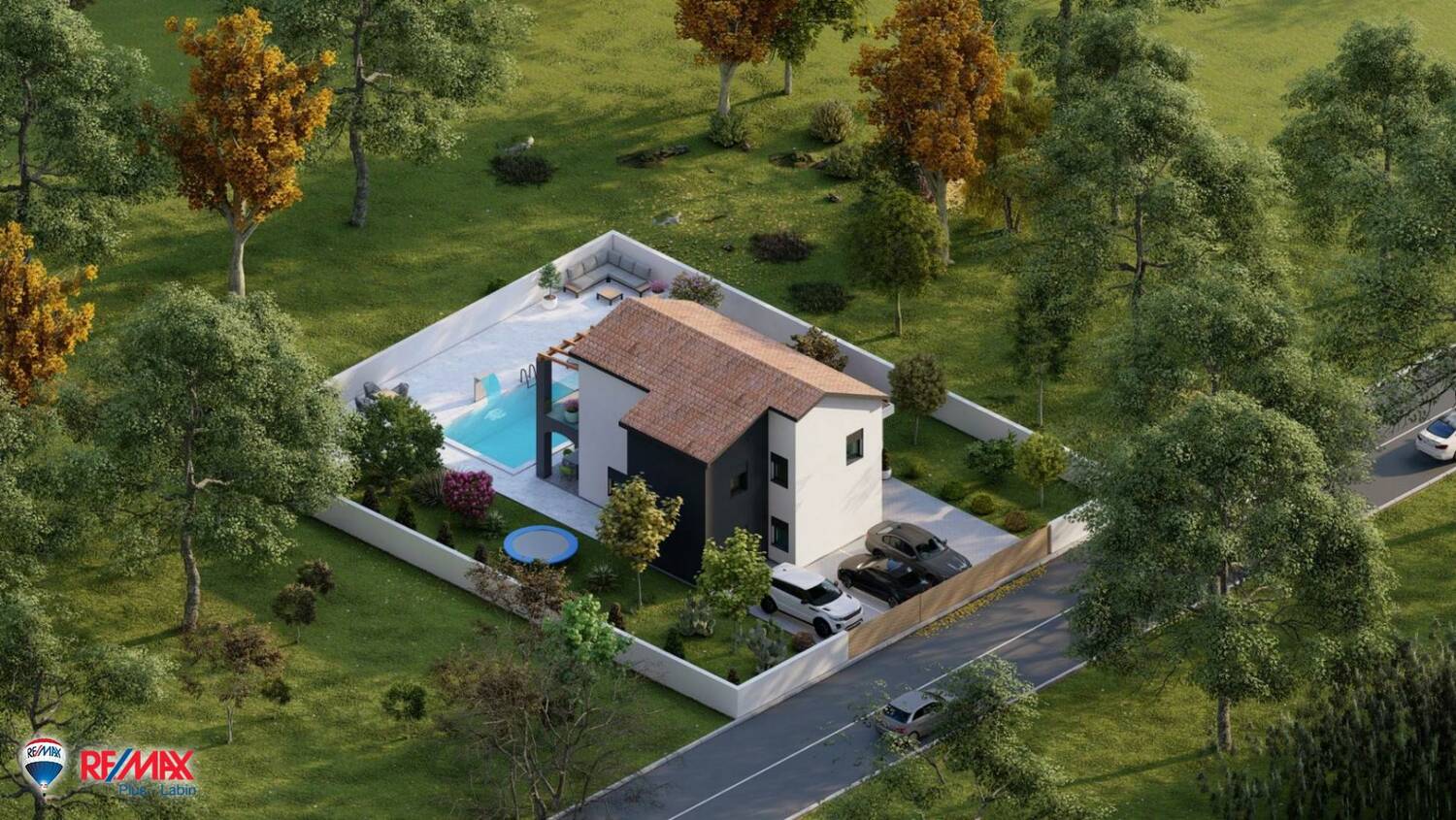 U blizini grada Labina, nudi se na prodaju građevinska parcela površine 500 m2 sa izrađenim projektom za obiteljsku kuću sa bazenom.