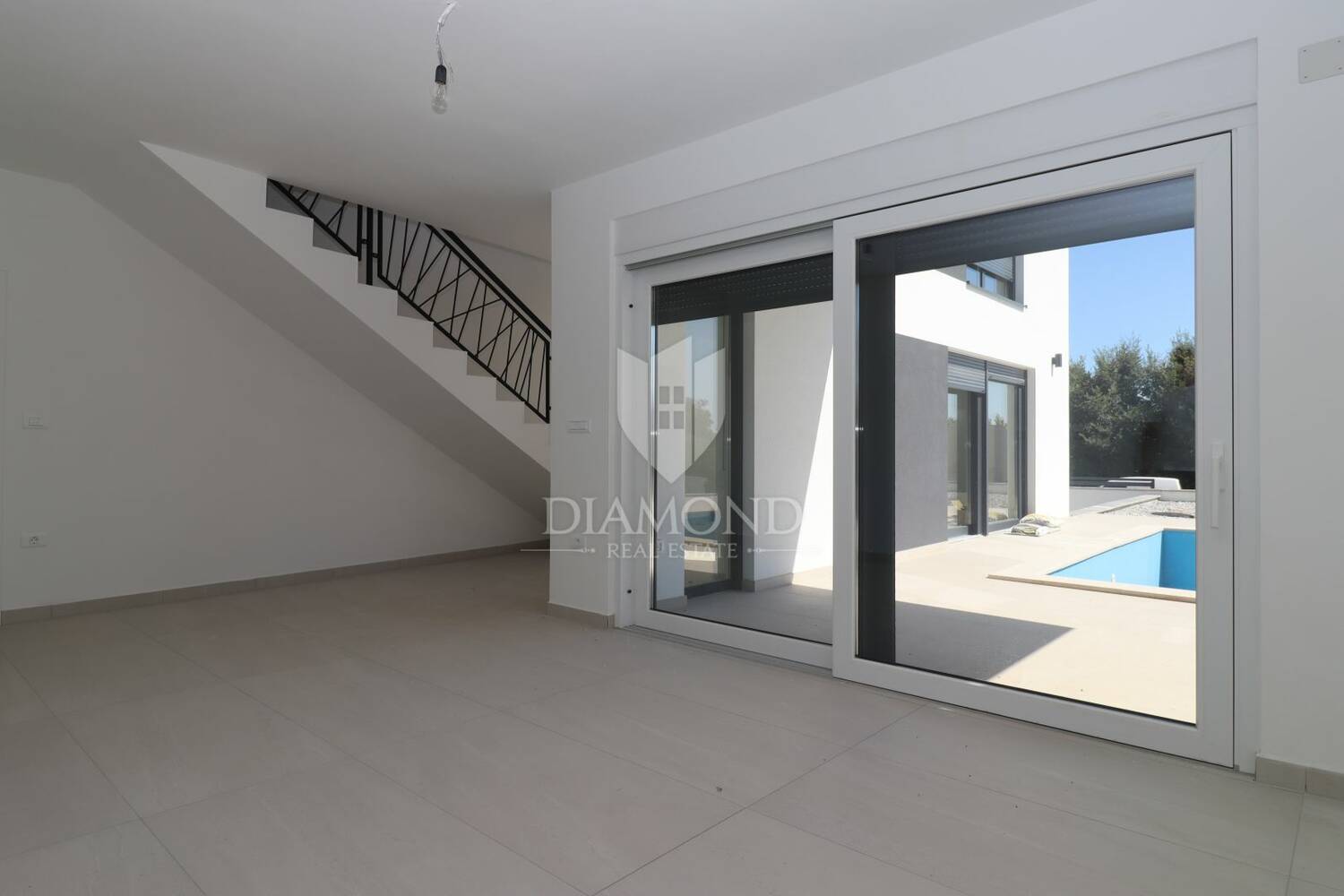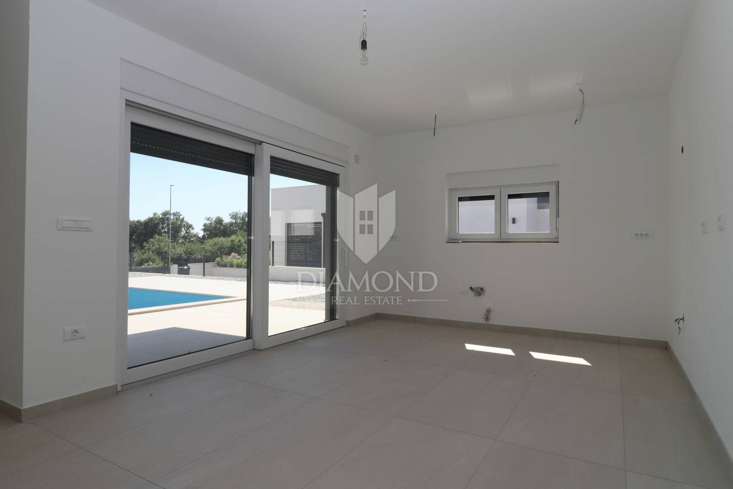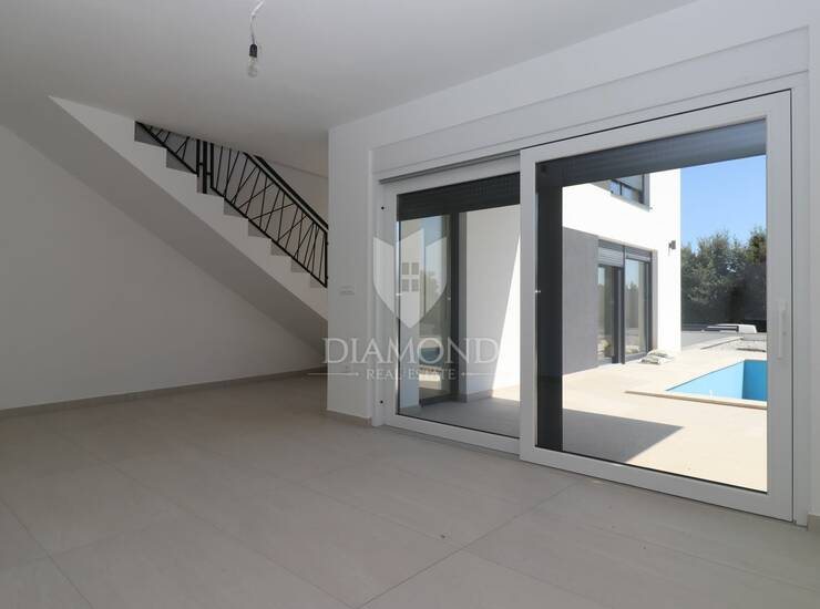 Ova potpuno nova dvojna kuća prostire se na dvije etaže te je pažljivo projektirana kako bi pružila maksimalnu funkcionalnost i udobnost stanovanja. Prizemlje se sastoji od prostranog dnevnog boravka povezanog s blagovaonicom i kuhinjom u otvorenom konceptu, uz dodatnu kupaonicu i praktično spremište. Na katu se nalaze tri udobne spavaće sobe i jedna kupaonica, a jedna od soba ima i djelomičan pogled na more u daljini. Kuća je u potpunosti klimatizirana, a posebnu vrijednost daje vlastiti bazen s popločenom sunčanom terasom te ograđena okućnica koja pruža osjećaj privatnosti i sigurnosti. Ispred kuće nalaze se i dva ograđena parkirna mjesta s automatskom kapijom.