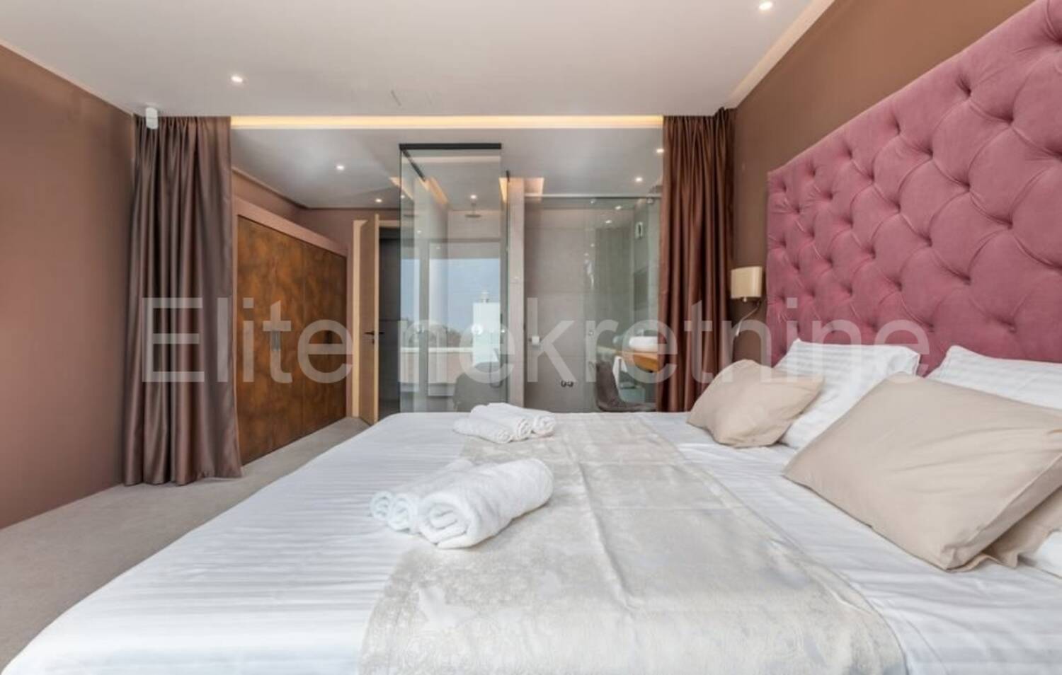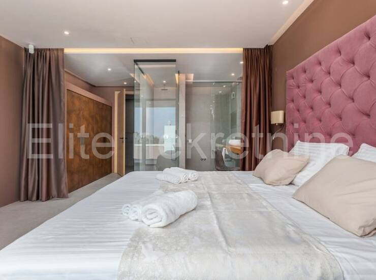 Ova moderna nekretnina sastoji se od 4 luksuzne spavaće sobe od kojih svaka ima svoju kupaonu i garderobu, prostranog dnevnog boravka, kuhinje, blagovaonice u open space konceptu, spremišta, fitnesa i saune te prekrasnog eksterijera sa nezaboravnim bazenom.