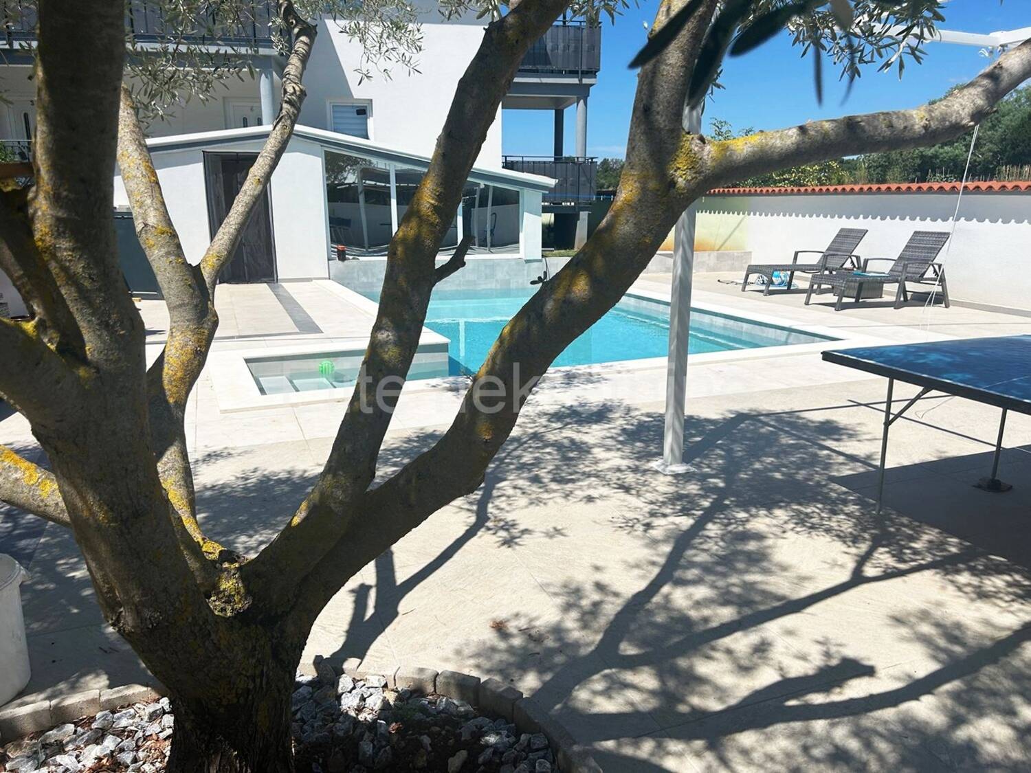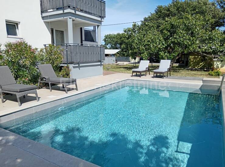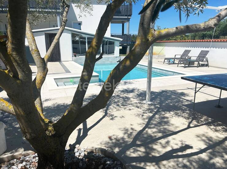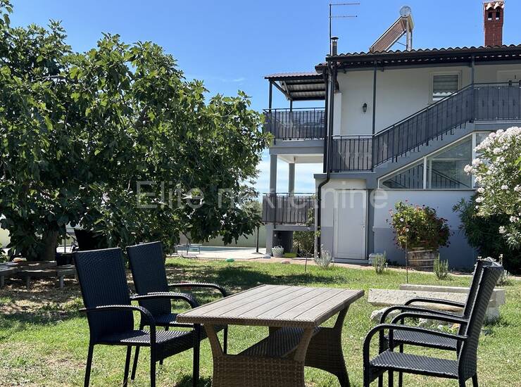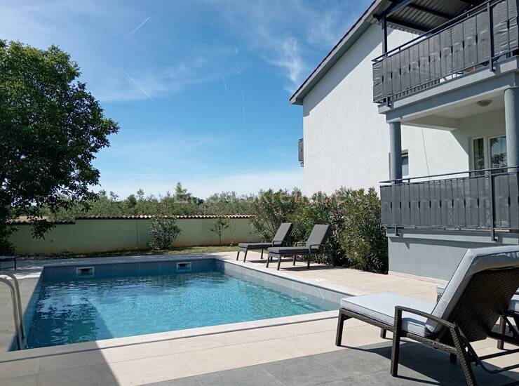 Kuća se sastoji od 4 kategorizirana apartmana i stanom u suterenu od 140m2. Idealna je za turistički najam, ali i kao luksuzna obiteljska rezidencija s dodatnim sadržajima. U dvorištu je bazen za goste sva 4 apartmana i još jedan bazen koji pripada stanu u suterenu. Ukupno ima 8 parkirnih mjesta unutar dvorišta, odvojen, natkriveni dio s roštiljem.Apartmani imaju 80m2 i svaki ima dva prostrana balkona, jedan iz dnevne sobe a drugi iz spavaćih soba. Iz velikog, povezanog dnevnog prostora, s jedne strane se ulazi u dvije spavaće sobe a s druge u kupaonu i zasebni WC. Svi su opremljeni klimama i imaju podno grijanje za komfor tijekom cijele godine.Kuća se prodaje potpuno uređena bez potrebe za dodatnim ulaganjima.Pogled se pruža na polja, maslinike i udaljene kuće. Mirno mjesto za potpuni odmor.Dvorište je ograđeno zidom i potpuno je uređeno.