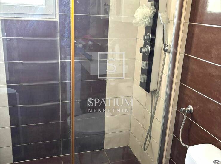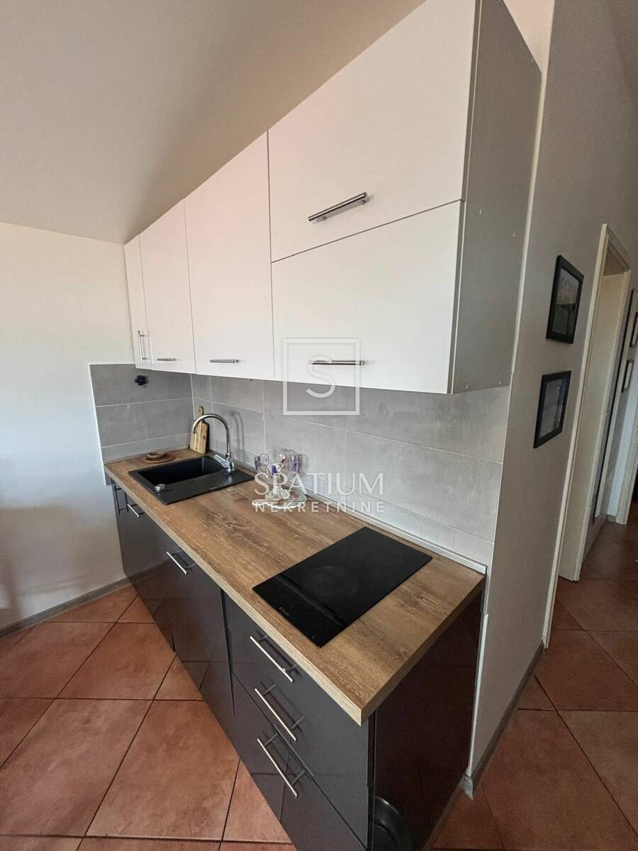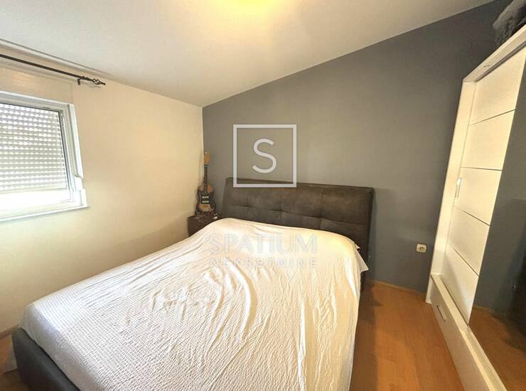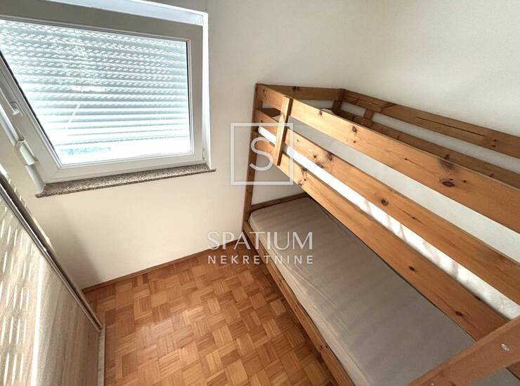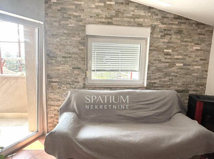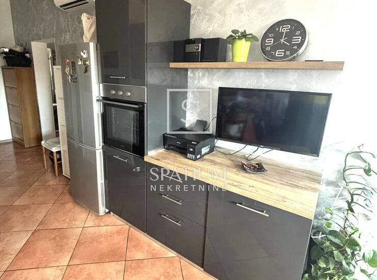 Stan se sastoji od kuhinje s manjim dnevnim dijelom, dvije spavaće sobe, kupaonice, terase i spremišta. Podne obloge kombinacija su parketa, laminata i keramike, što prostoru daje toplinu i funkcionalnost. Za ugodnu temperaturu tijekom cijele godine koristi se peć na pelete i klima inverter Daikin.