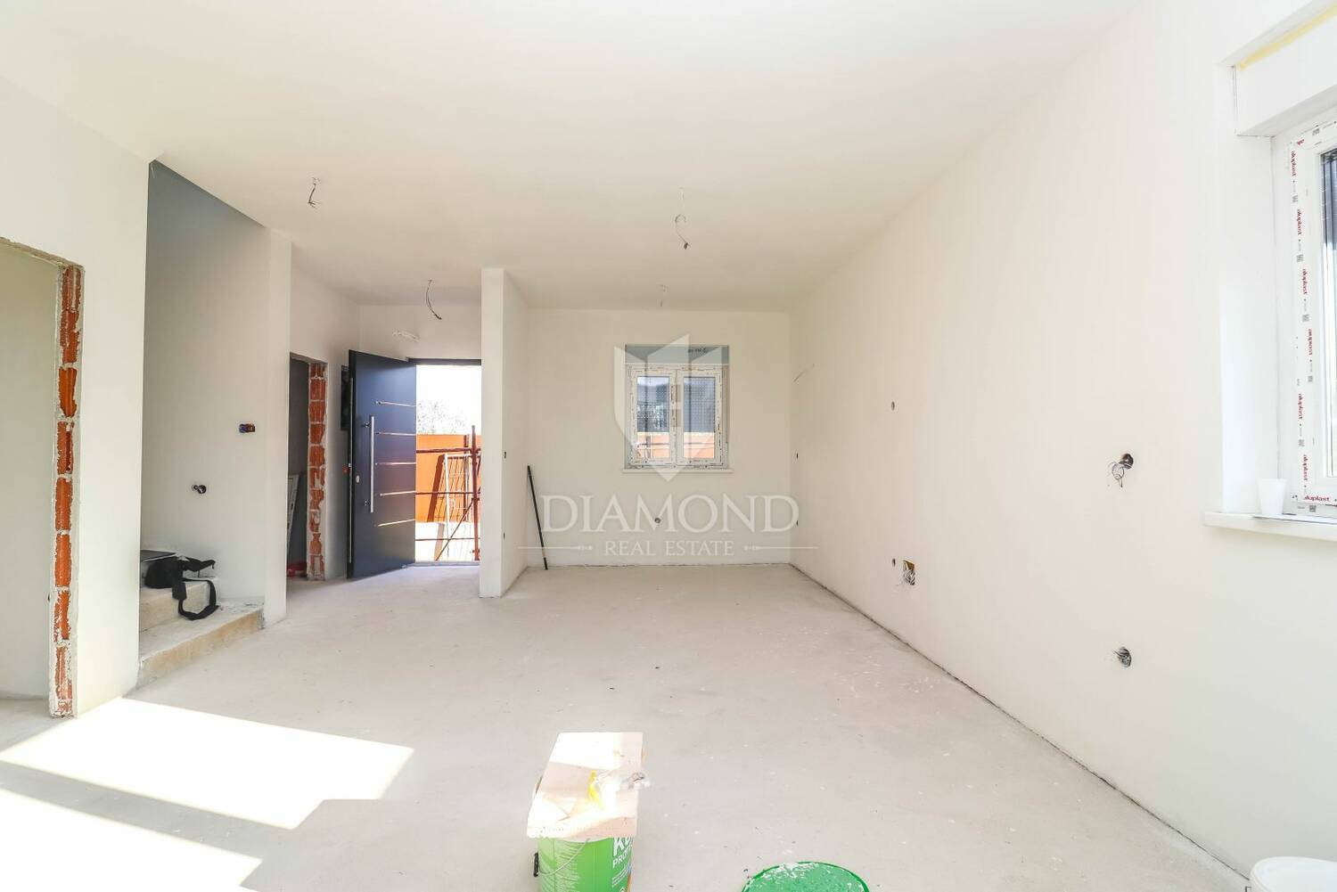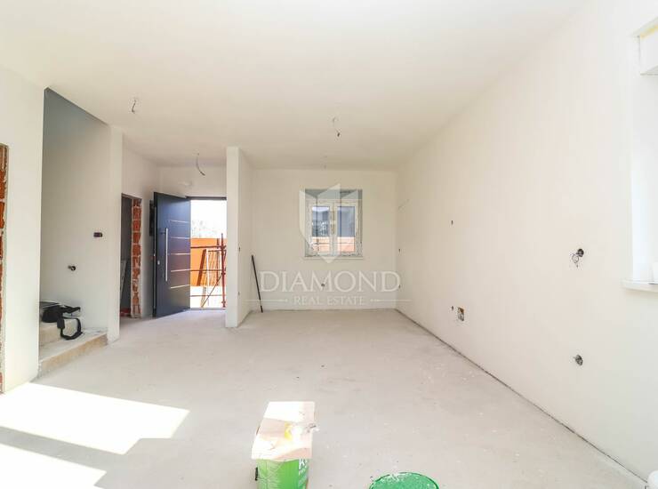 Stan se prostire kroz prizemlje i prvi kat (posljednju etažu). U prizemlju se nalazi otvoreni koncept dnevnog boravka s kuhinjom i blagovaonicom, kupaonica , ostava te izlaz na nenatkrivenu terasu i privatni vrt, idealan za druženja, opuštanje ili uređenje po vlastitim željama. Na gornjoj etaži smještene su dvije komforne spavaće sobe, svaka s vlastitom kupaonicom. Jedna soba dodatno raspolaže garderobom i izlazom na balkon, što prostoru daje dodatnu funkcionalnost i komfor. Zgrada je trenutno u roh-bau fazi, što budućem vlasniku omogućuje potpunu slobodu uređenja interijera prema vlastitom ukusu i potrebama.