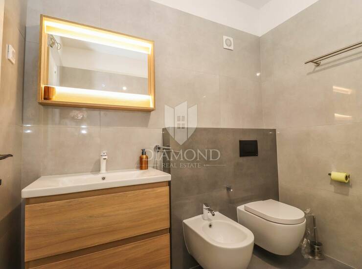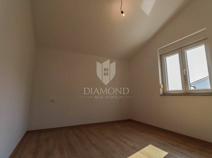 Na prodaju je trosoban stan smješten na prvom katu duplex kuće, pažljivo projektiran za udoban i funkcionalan život. Stan se sastoji od tri spavaće sobe, prostranog dnevnog boravka povezanog s kuhinjom te dvije moderno uređene kupaonice. Dodatnu praktičnost pružaju dvije ostave u sklopu kuće. Nekretnina je građena vrhunskim materijalima – fasada je u elegantnoj grafitnoj boji s bijelim antirefleksnim slojem, ugrađena je dizalice topline marke Vaillant te podno grijanje Uponor, što osigurava energetsku učinkovitost i vrlo niske mjesečne režije. Stan je opremljen s dva klima uređaja, a posebna pažnja posvećena je komforu i miru – sva vrata u spavaćim sobama su masivna i imaju četkice na dnu za maksimalnu zvučnu izolaciju. Udaljenost od mora iznosi svega 4,5 km, dok se do Pule stiže za otprilike 10 minuta vožnje.