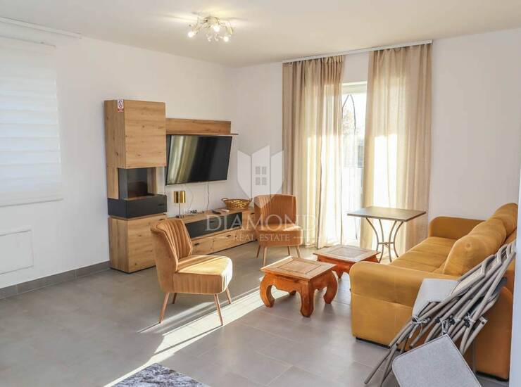 Ovaj stan u prizemlju je kompletno renoviran i moderno opremljen. Sastoji od otvorenog prostora koji dijele dnevni boravak sa kuhinjom i blagovaonicom i izlazom na terasu. U nastavku se nalaze dvije spavaće sobe sa izlazom na prostranu terasu sa pogledom na zelenilo te kupaonica i gostinjski wc. Ukupna kvadratura iznosi 85m2. Uz stan dolazi vrt na korištenje sa bazenom te natkriveno parking mjesto.