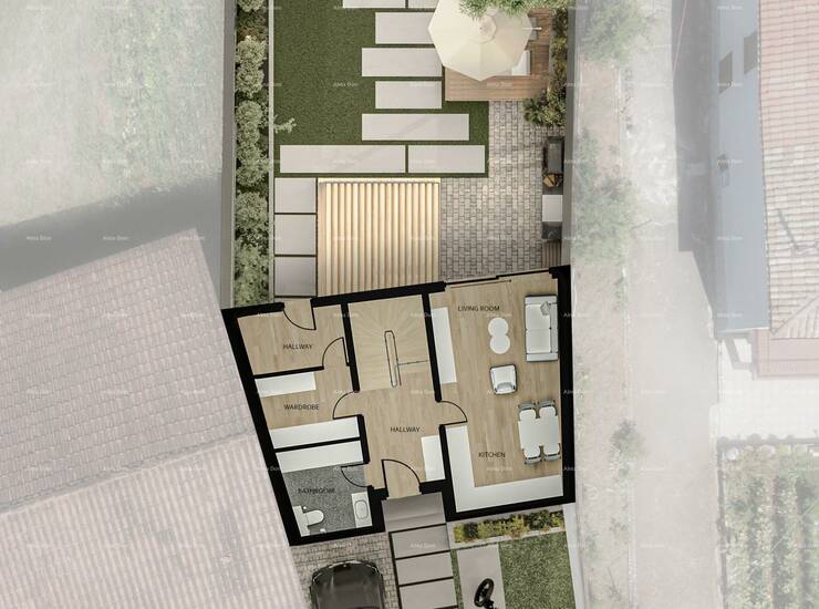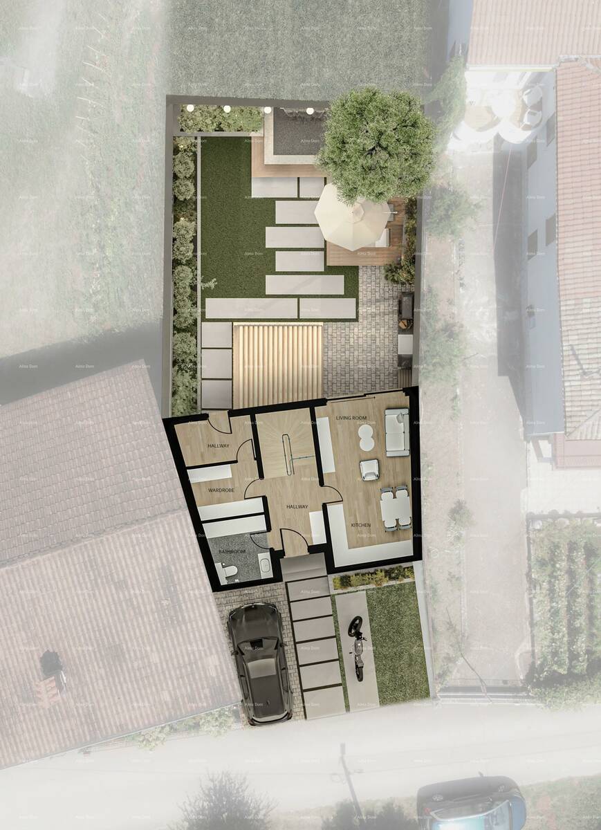 - u prizemlju, 48 m2 neto, nalazit će se kuhinja i dnevni boravak, wc i praona, hodnik i stepenište, ostava i tehnička soba
