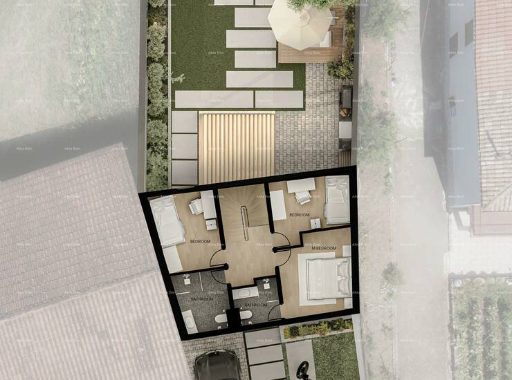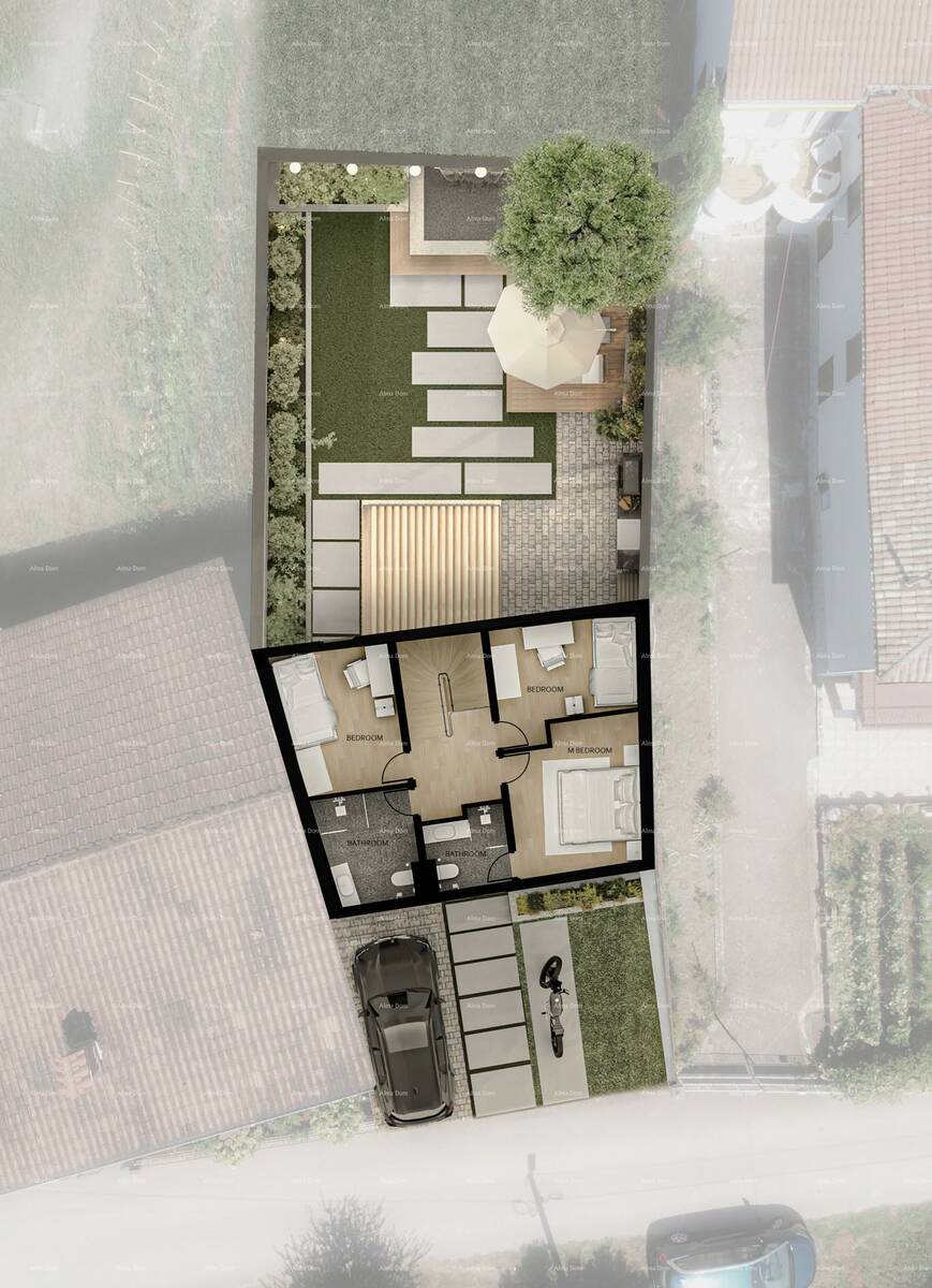 - na prvom katu, 45 m2 neto, nalazit će se 3 spavaće sobe i dva kupatila