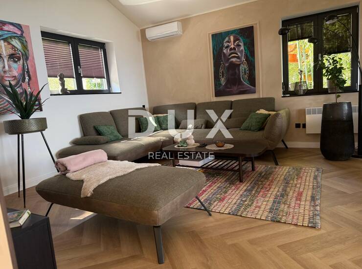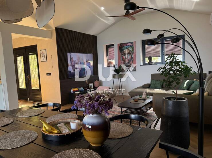 Kuća je građena i opremljena bez kompromisa u kvaliteti: visokoklasni vinil podovi, mikrocementne površine, aluminijska stolarija i prirodni kamen samo su neki od elemenata koji svjedoče o razini izvedbe. Prodaje se potpuno namještena i opremljena – sve novo, spremno za useljenje bez dodatnih ulaganja.