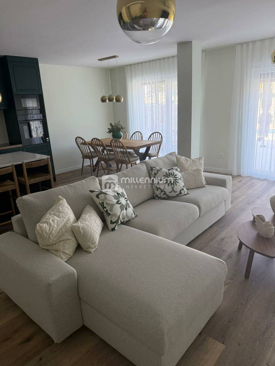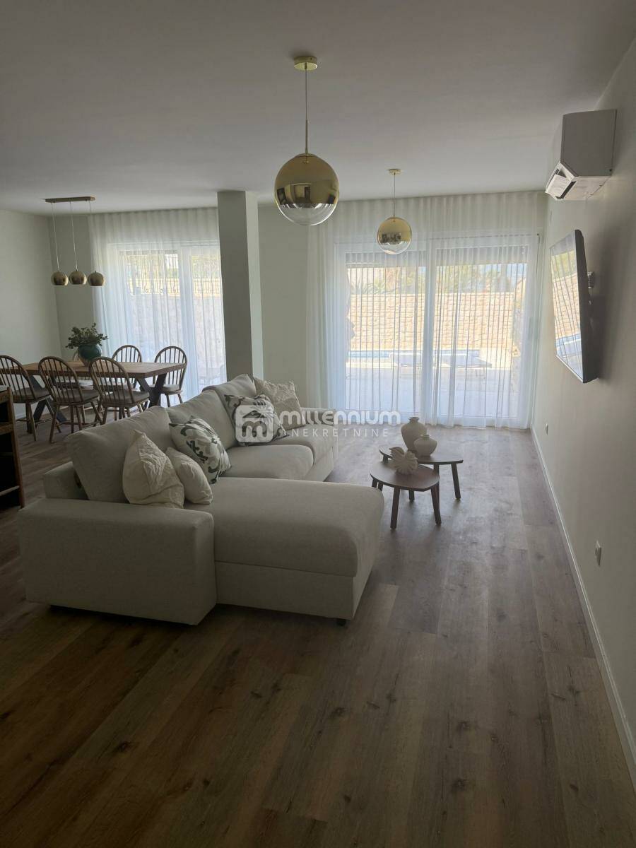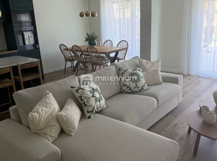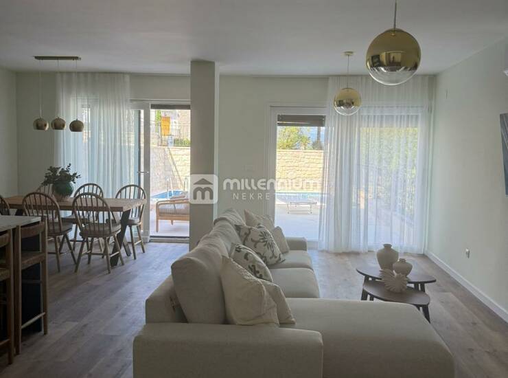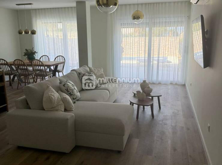 Stan se prostire na dvije etaže – prizemlje i prvi kat. U prizemlju se nalazi prostrani open space dnevni boravak s kuhinjom i blagovaonicom, osmišljen kao ugodan prostor za druženje i opuštanje, s direktnim izlazom na privatnu okućnicu površine 43.79m². Okućnica nudi pravi mali luksuz – vlastiti bazen veličine 10.38m², idealan za uživanje u toplim danima. Na istoj etaži smješten je i toalet te stubište koje vodi na kat.
