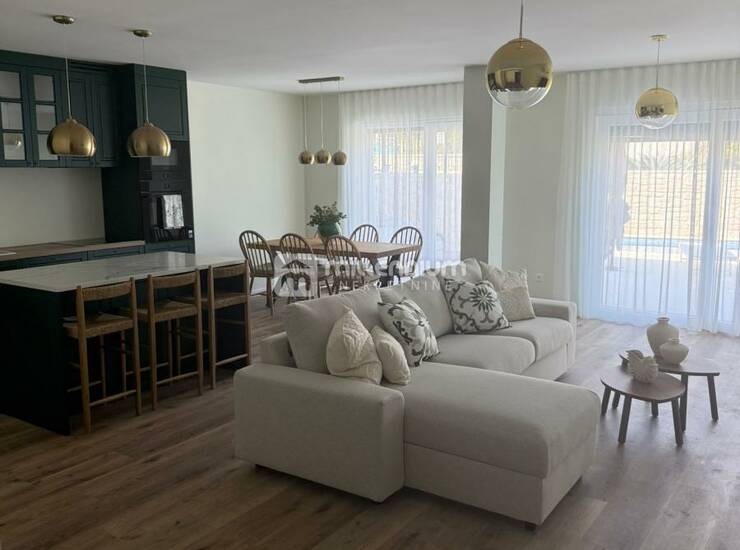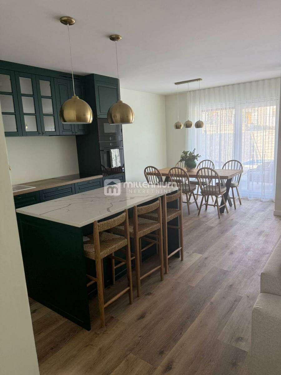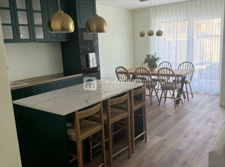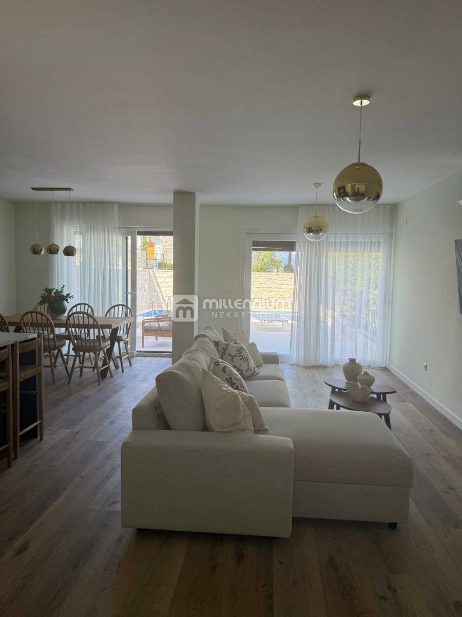Stan se prostire na dvije etaže – prizemlje i prvi kat. U prizemlju se nalazi prostrani open space dnevni boravak s kuhinjom i blagovaonicom, osmišljen kao ugodan prostor za druženje i opuštanje, s direktnim izlazom na privatnu okućnicu površine 43.79m². Okućnica nudi pravi mali luksuz – vlastiti bazen veličine 10.38m², idealan za uživanje u toplim danima. Na istoj etaži smješten je i toalet te stubište koje vodi na kat.