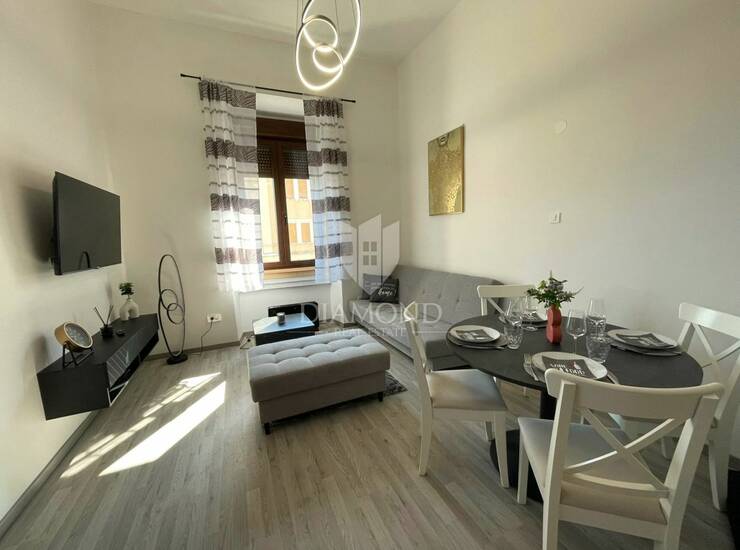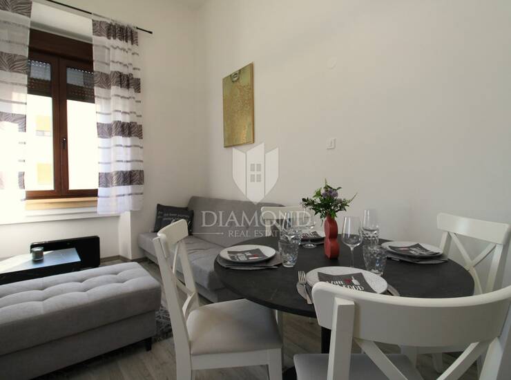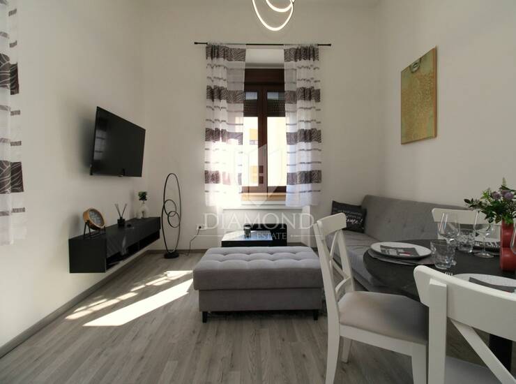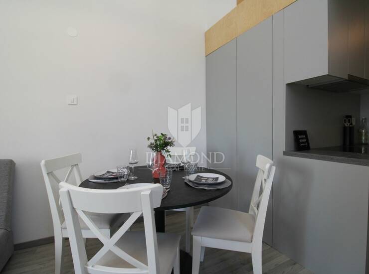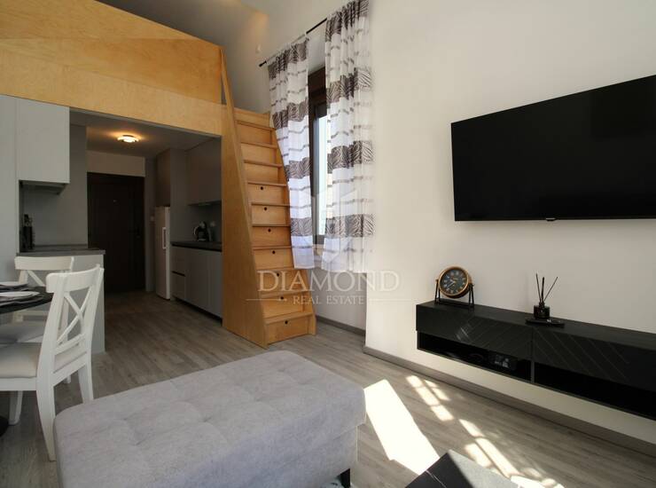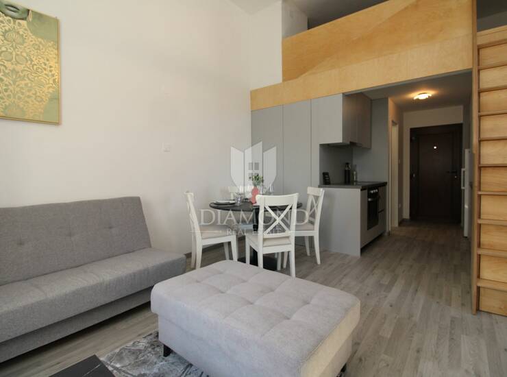 U ponudi je potpuno uređen i adaptiran apartman smješten na prvom katu, ukupne površine 30 m² uz dodatnu galeriju koja pruža funkcionalan prostor za spavanje. Apartman se sastoji od ugodnog dnevnog boravka povezanog s blagovaonicom i kuhinjom, moderne kupaonice te galerije na kojoj se nalazi spavaća soba.