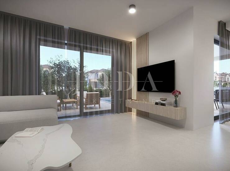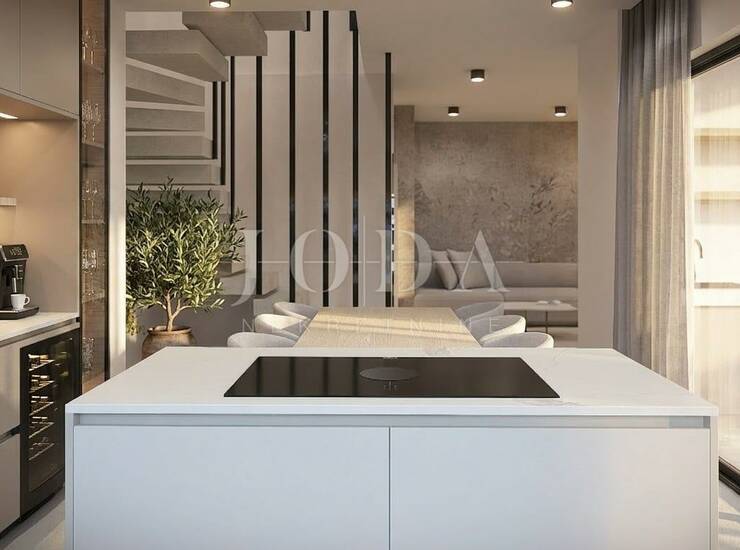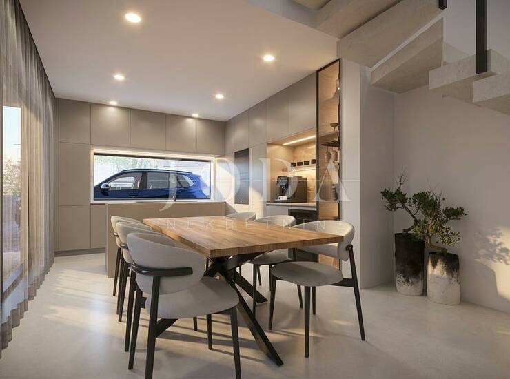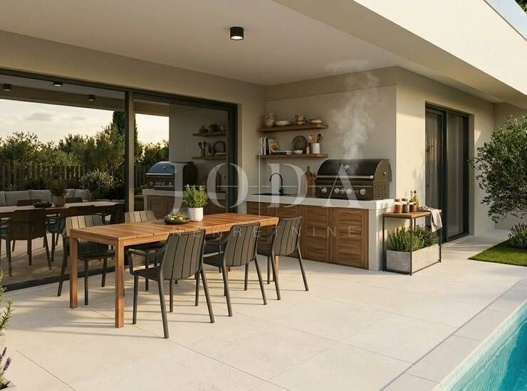 Nekretnina ima površinu od 130 m2 a proteže na prizemlje i kat. U prizemlju se nalazi ulazni prostor, wc, spremište, dnevni boravak s kuhinjom i blagovaonicom otvorenog koncepta i velika natkrivena terasa. Na katu se nalazi hodnik, tri spavaće sobe svaka sa svojom kupaonicom i terasa s pogledom na more. Kuća se prodaje po sistemu ključ u ruke, s uređenom okućnicom s bazenom i dva parkirna mjesta. Kvalitetna gradnja s podnim grijanjem s dizalicom topline, PVC stolarija u dekoru drva s roletama, klimatizacija svih prostorija, grijani bazen i ljetna kuhinja. Na okućnici se nalazi spremište u kojem će biti i bazenska tehnika. Useljenje se očekuje za ljeto 2026.