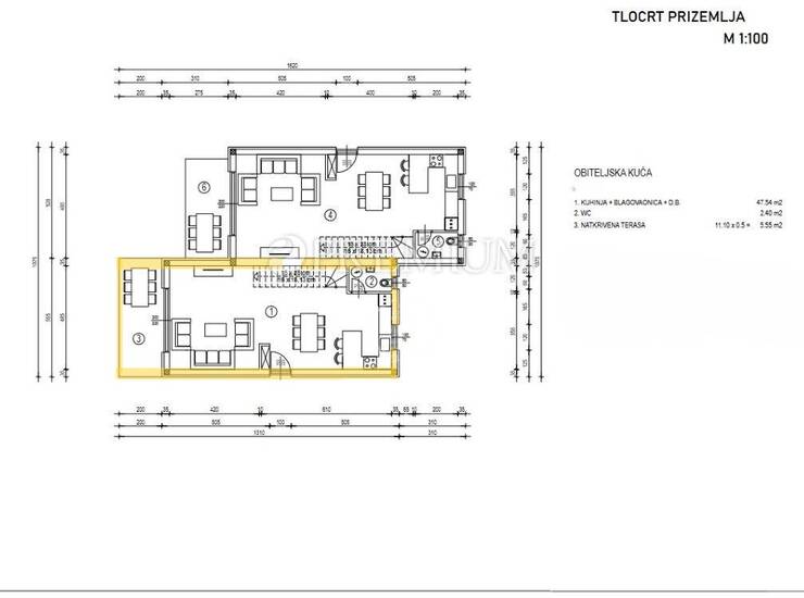 Unutarnje stepenište povezuje kat s prizemljem, gdje se nalazi ulazni prostor, gostinjski wc te prostrani open space dnevni dio koji obuhvaća kuhinju, blagovaonicu i dnevni boravak. Iz dnevnog prostora izlazi se na natkrivenu terasu i okućnicu, na kojoj je predviđen bazen sa sunčalištem.