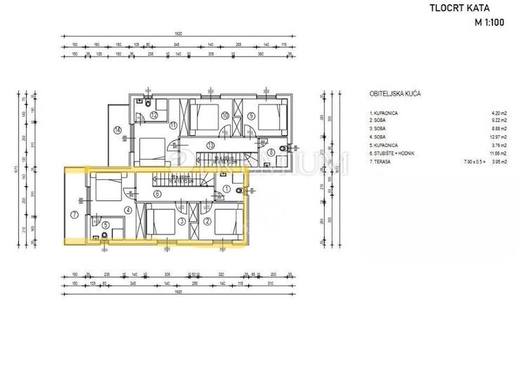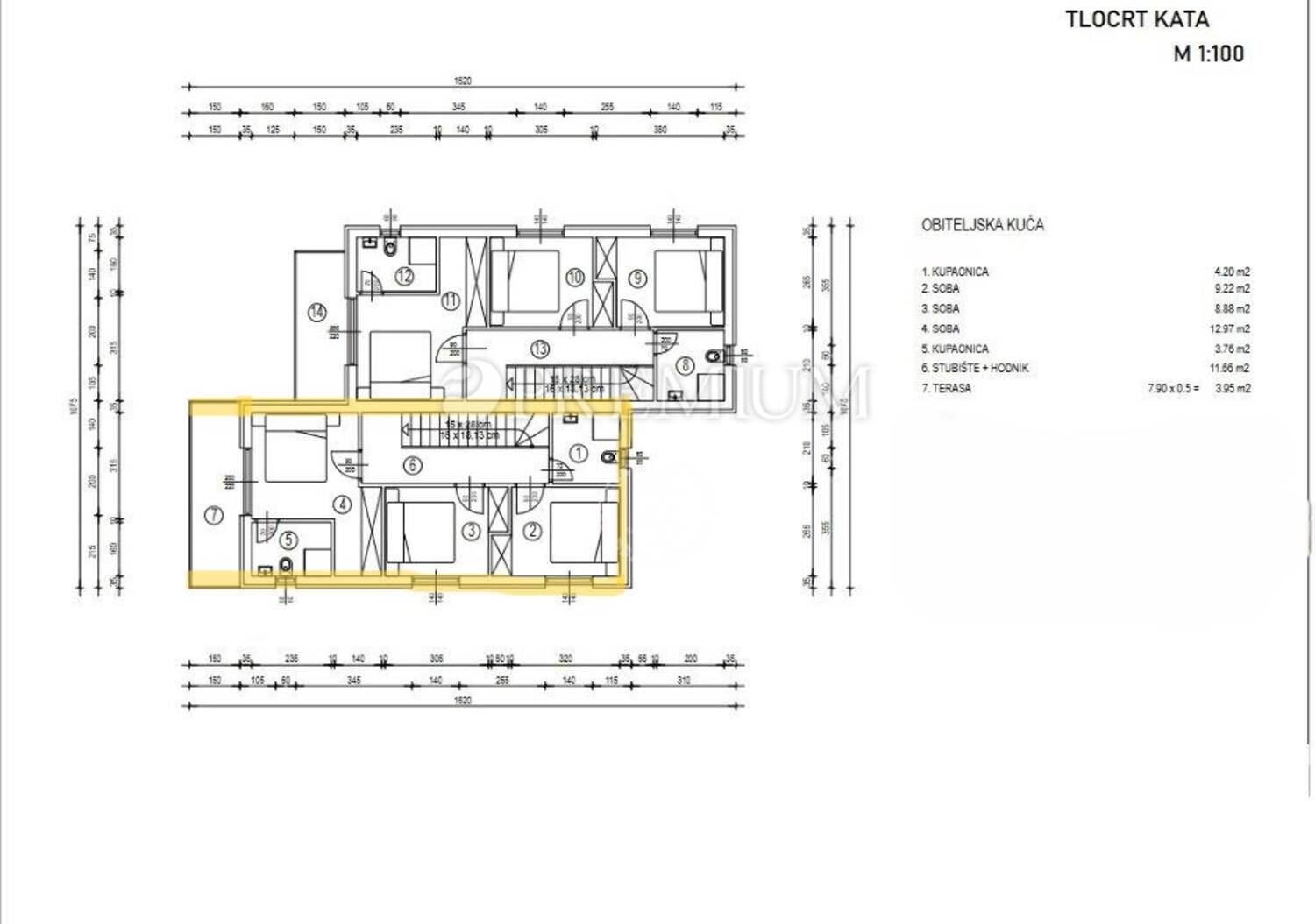 Na prvom katu nalazi se hodnik, kupaonica te tri spavaće sobe, od kojih master spavaća soba ima vlastitu kupaonicu i izlaz na terasu s pogledom na more.