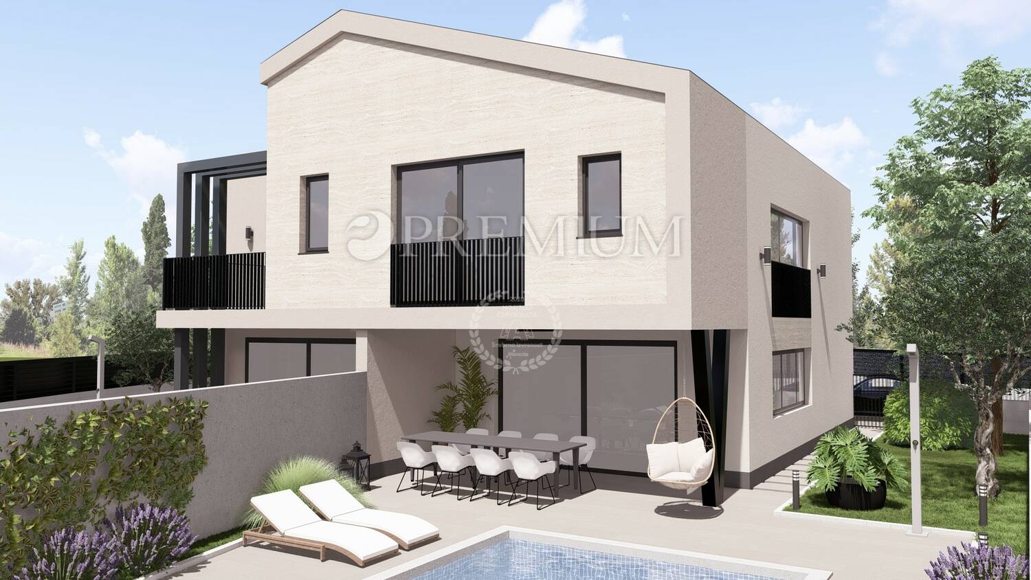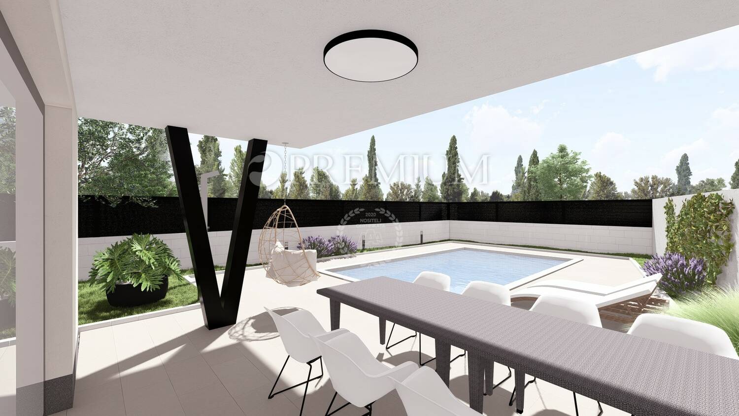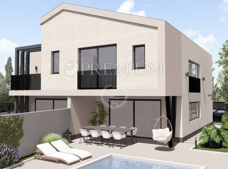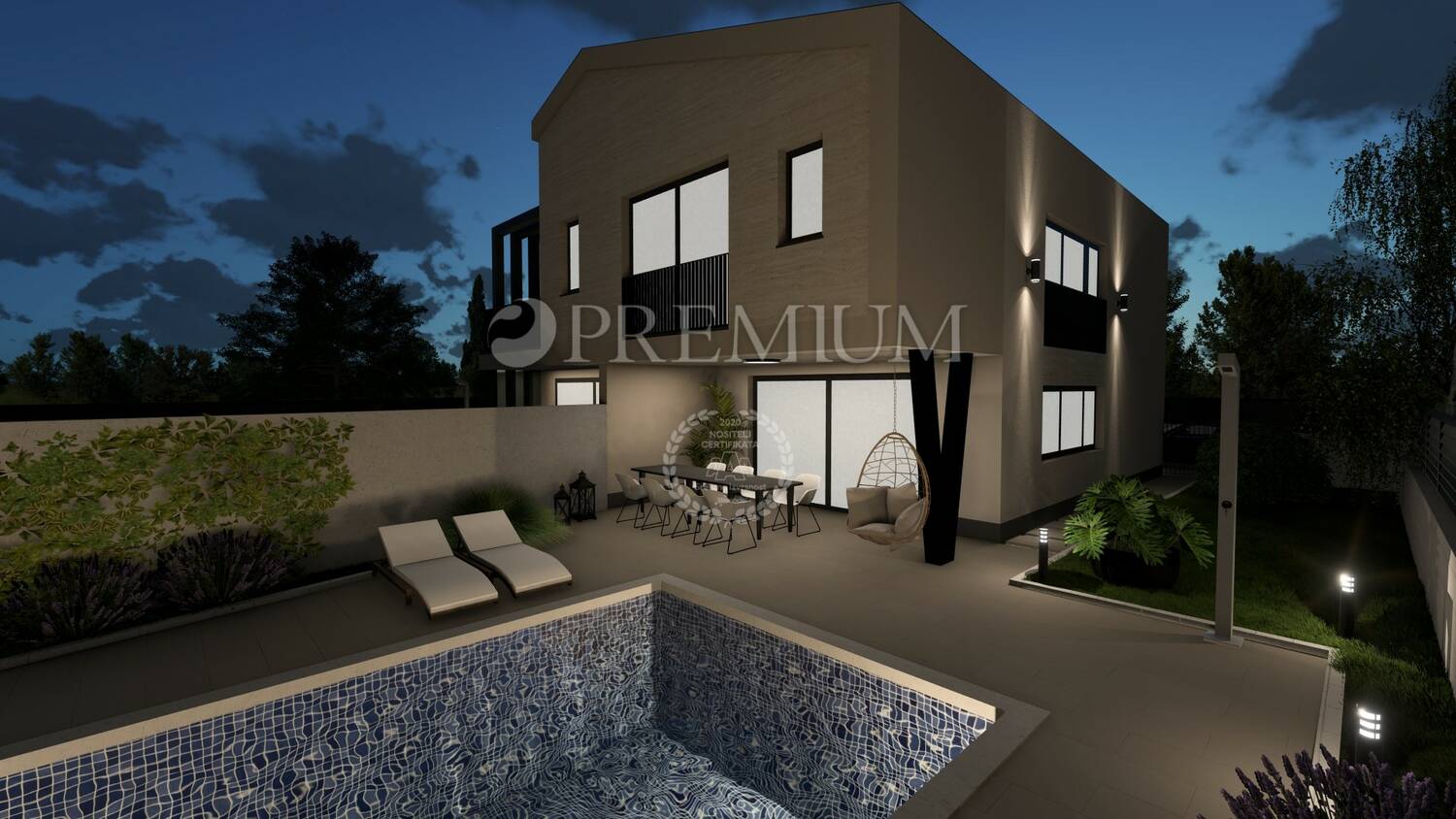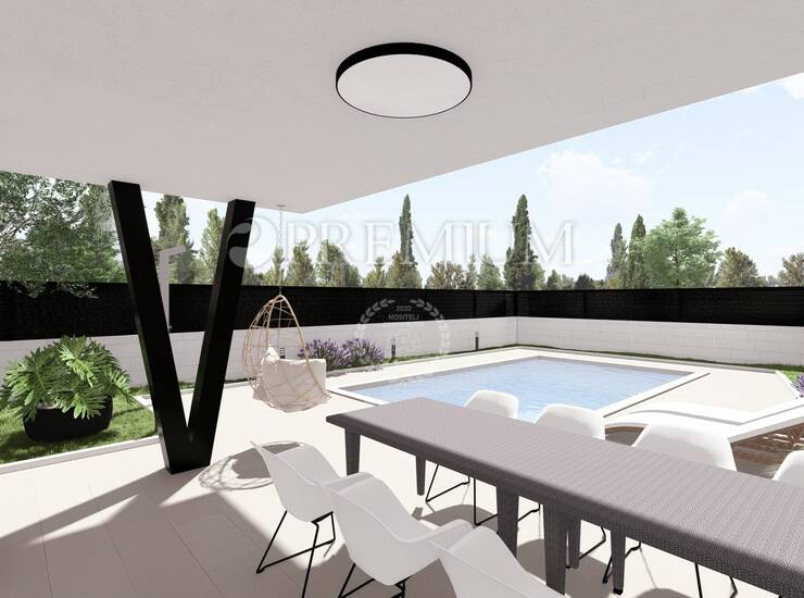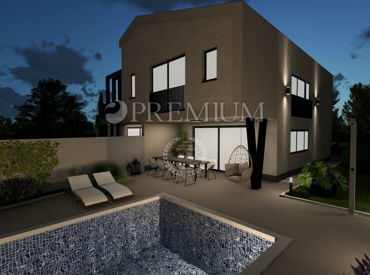 Okućnica cca 200m2, s bazenom površine 18m2 i sunčalištem je opremljena sustavom automatskog navodnjavanja i sadrži dva parkirna mjesta.