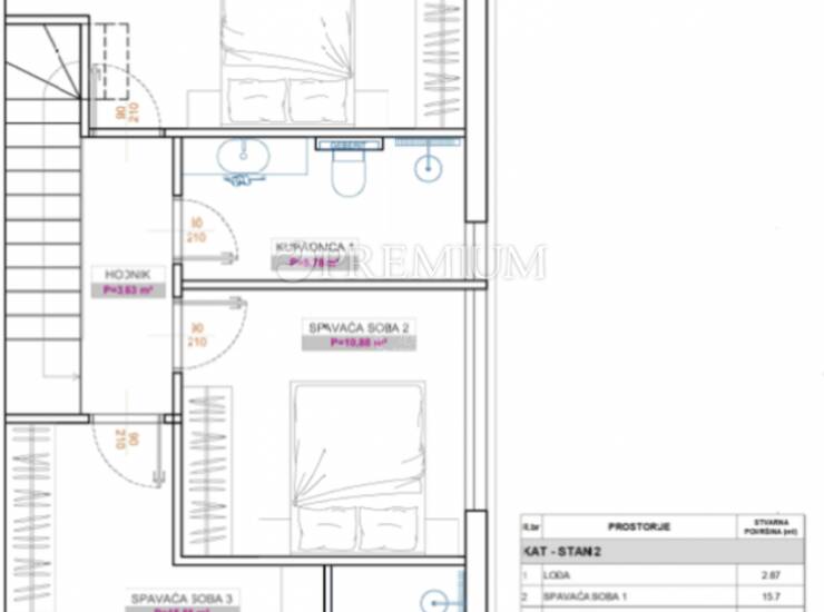 Na katu se nalazi hodnik, tri spavaće sobe i dvije kupaonice. Master soba ima vlastitu kupaonicu.