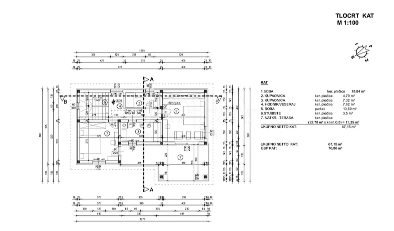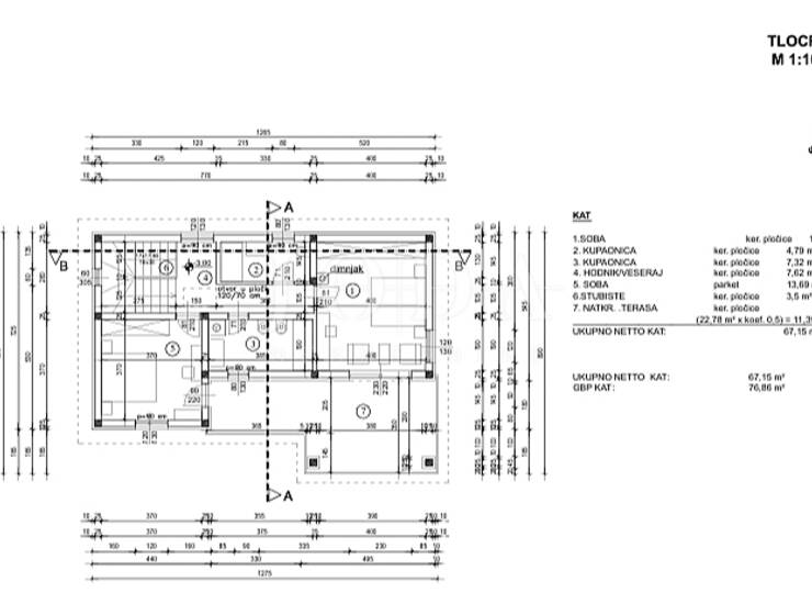 Na katu su smještene dvije spavaće sobe, dvije kupaonice, hodnik te veliki zajednički natkriveni balkon.
