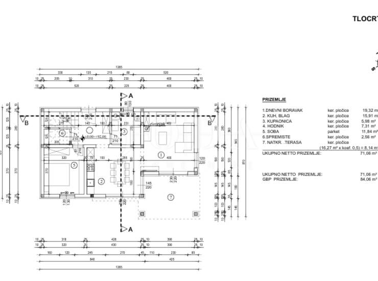 U prizemlju se nalazi otvoreni koncept dnevnog boravka, kuhinje i blagovaonice, hodnik, kupaonica, jedna spavaća soba te spremište. Prizemlju pripada i prostrana natkrivena terasa.