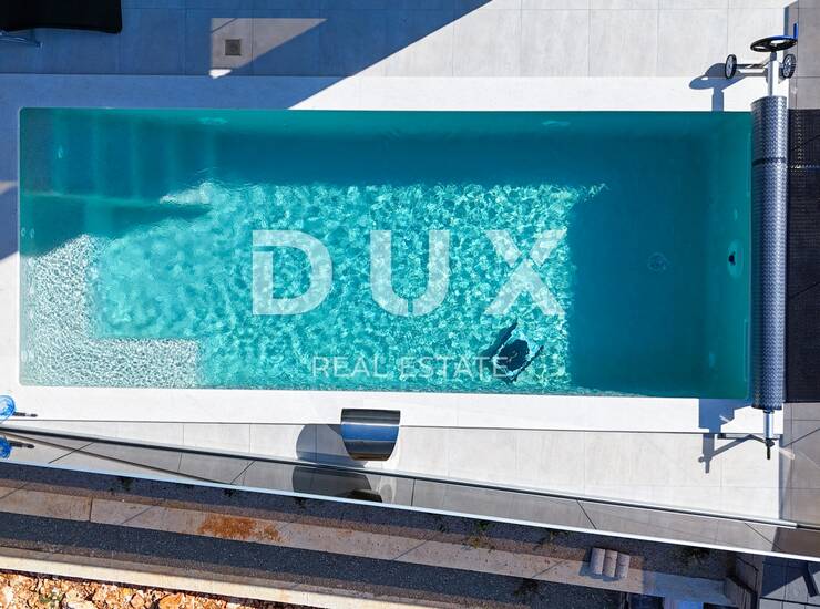 Iz dnevnog boravka i kuhinje izlazimo na veliku terasu i dolazimo do dragulja ove vile - bazena i to ne bilo kakvog. Bazen je grijani, sa slanom vodom, masažnim sustavom i protustrujnim plivanjem. Podzemna strojarnica s opremom i dizalicom topline brine da sve funkcionira besprijekorno. Ono što je za napomenuti je svakako i obloga bazena, nije keramika, nije folija već vodootporni kulir svijetle boje, iznimno dugotrajan i daje bazenu posebnu boju. Okućnica je uređena mediteranskim biljem,
