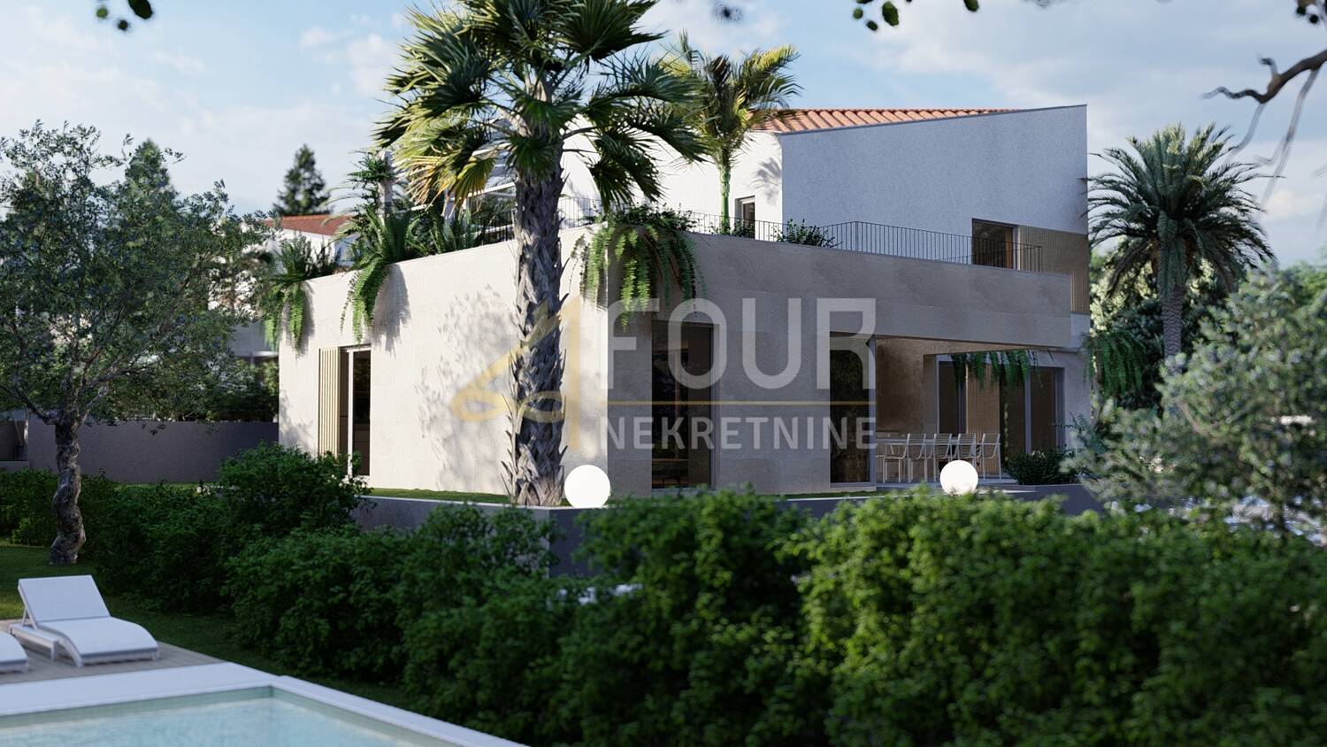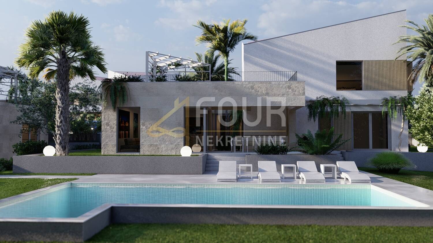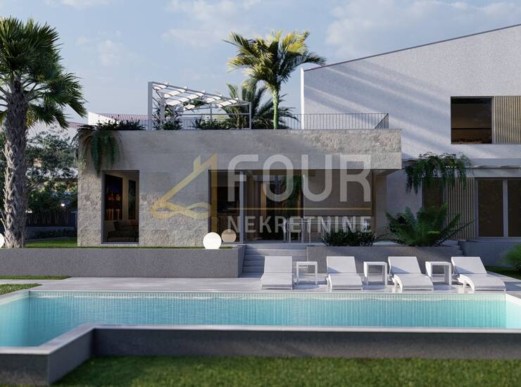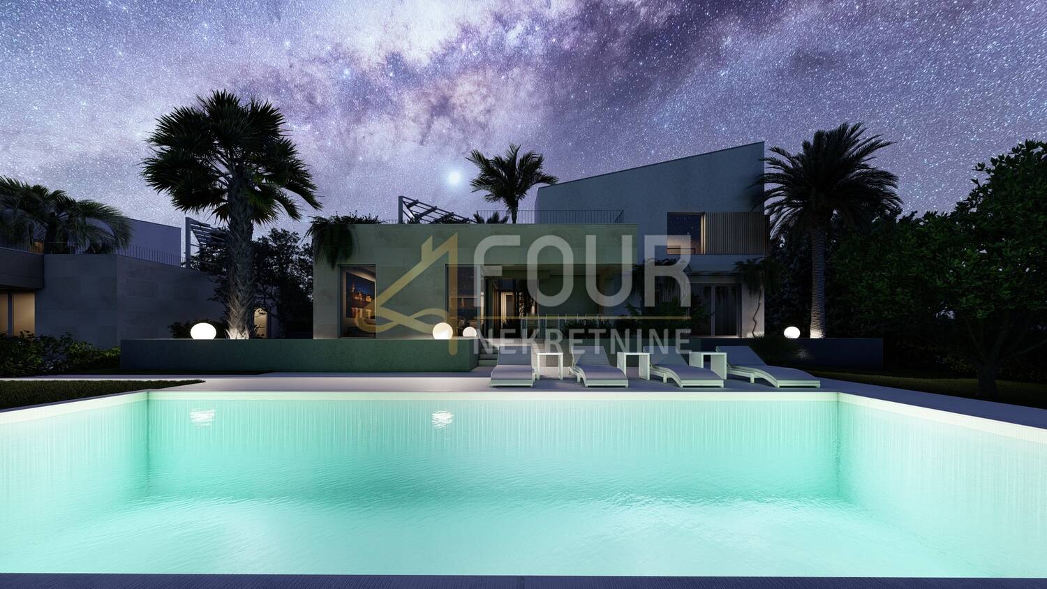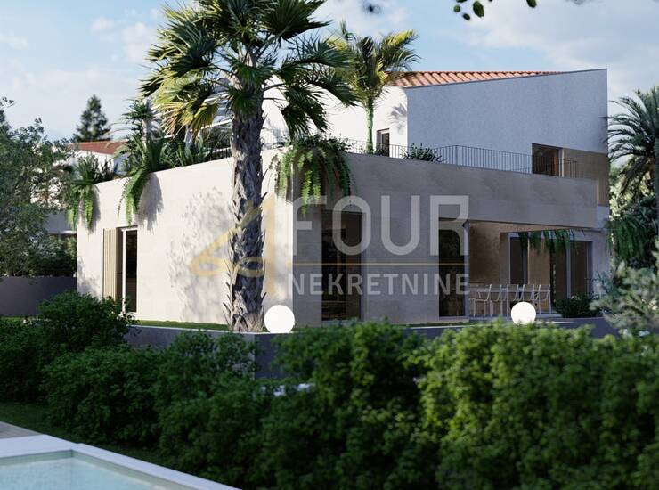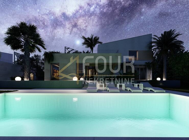 Prodaje se moderna luksuzna vila s privatnim bazenom i pogledom na more, smještena u ekskluzivnom resortu na otoku Krku, svega jedan kilometar od obale. Riječ je o novogradnji s planiranim dovršetkom 2026. godine, pomno projektiranoj kako bi ponudila savršen spoj udobnosti, privatnosti i visokog standarda gradnje. Kuća raspolaže s ukupno 198,67 m2 stambene površine raspoređene kroz tri etaže: podrum, prizemlje i prvi kat.