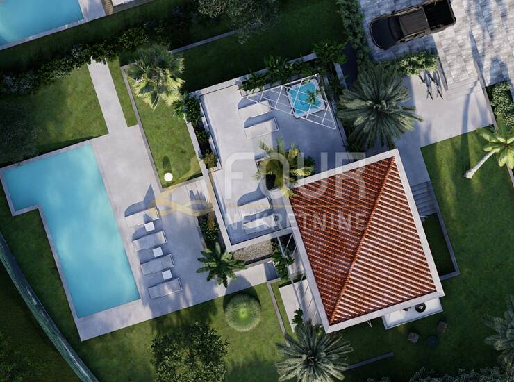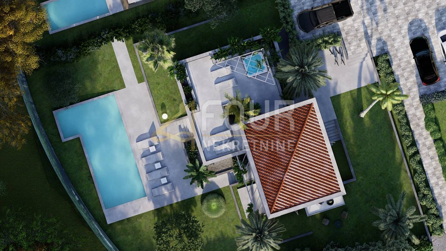 Vila je opremljena Daikin klima uređajima, podnim grijanjem i aluminijskom stolarijom visoke kvalitete. Uređeni eksterijer uključuje natkriveni trijem, ljetnu kuhinju te privatni grijani bazen površine 40 m2. Terase u prizemlju i na katu proširuju životni prostor i omogućuju uživanje u pogledu na more i zelenilo resorta.