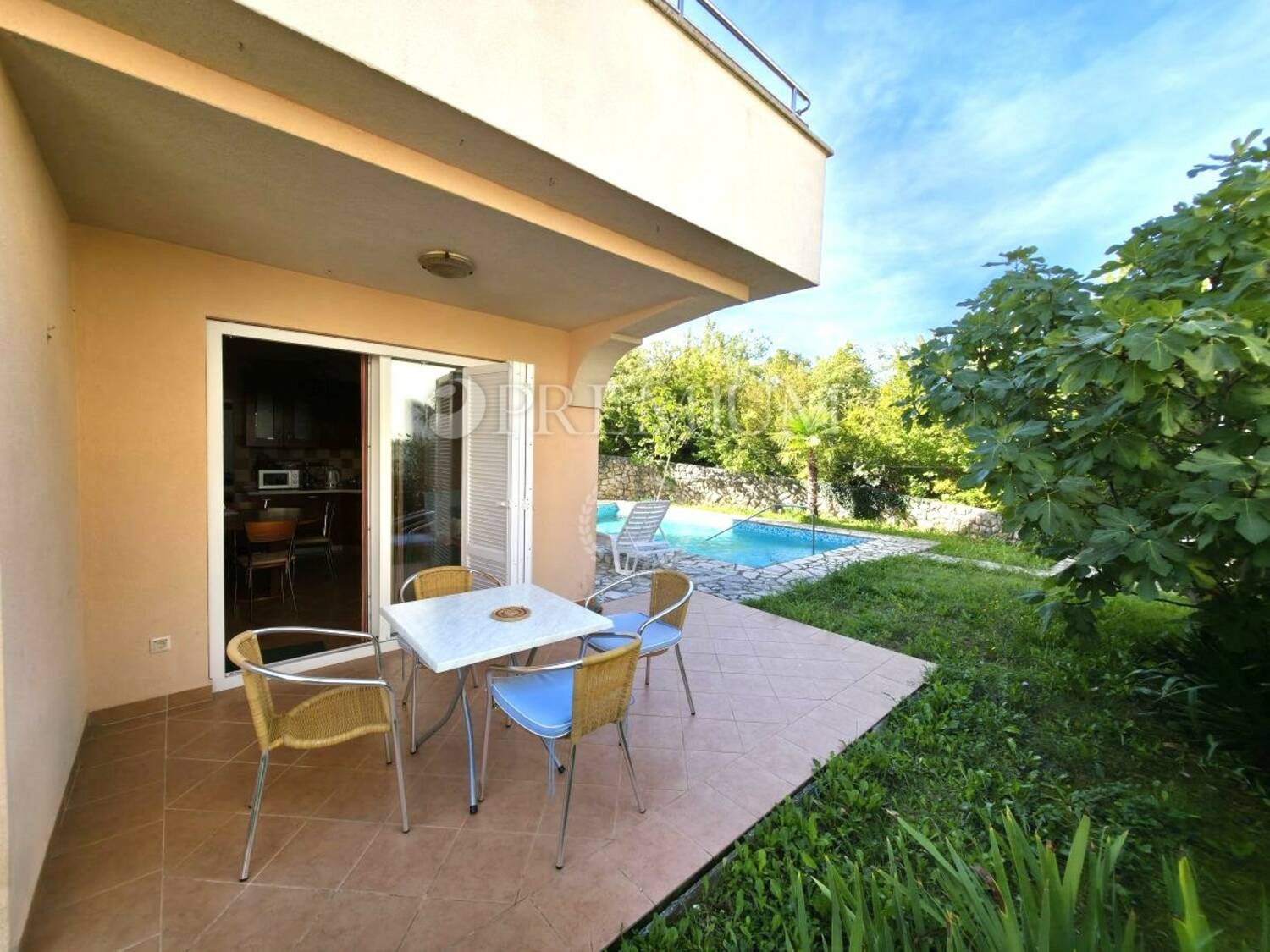 Malinska – prodaja dvosobnog apartmana s bazenom i okućnicom od 100 m2, samo 150 m od mora!