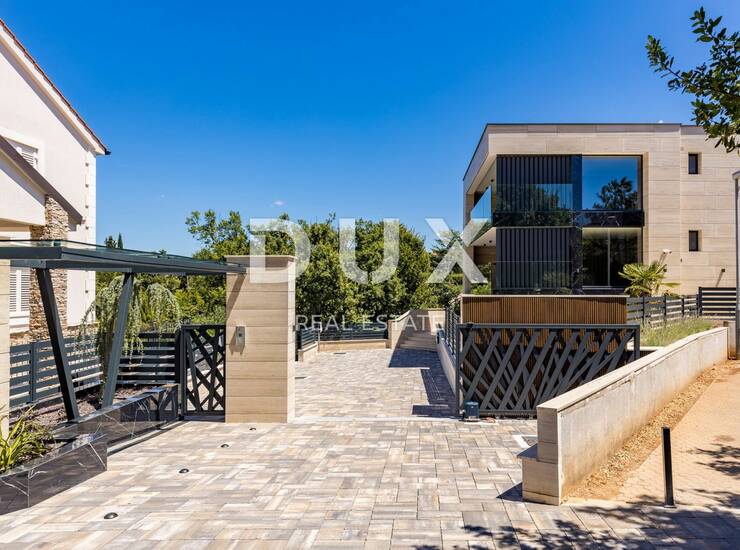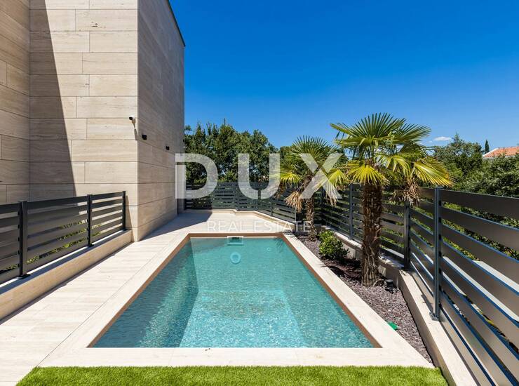 Stanu pripada 60 m2 okućnice s privatnim bazenom te jedno parkirno mjesto, s priključkom za punjenje električnih automobila. Nekretnina je građena vrhunskim materijalima, ima podno grijanje, hlađenje Mitsubishi klimama unutarnje jedinice u svakoj prostoriji, vanjska stolarija s velikim kliznim stijenama (podizno klizne), podovi obloženi keramikom porculan visoke kvalitete, spušteni stropovi s ugrađenom rasvjetom, ulazna protuprovalna vrata talijanski proizvođač (Diere), sobna vrata od orah drveta također talijanskog proizvođača Diere, vanjska fasada je od ventilirajućeg Rimskog kamena Travertin.