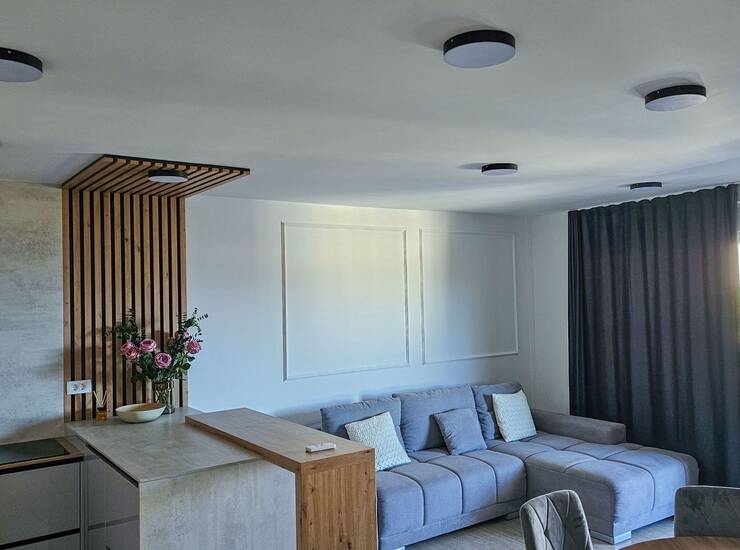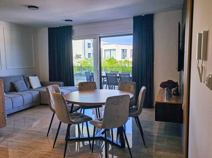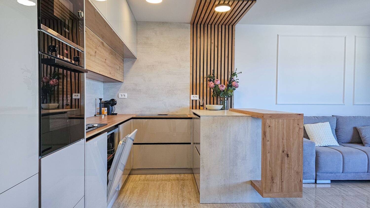 Apartman se sastoji od prostranog dnevnog boravka s kuhinjom i blagovaonom u open-space konceptu, tri luksuzno opremljene spavaće sobe, svaka s vlastitom kupaonicom, te dodatnog WC-a. Iz dnevnog boravka izlazi se na natkrivenu terasu od 15 m², idealnu za uživanje u pogledu na more i opuštanje uz jutarnju kavu.