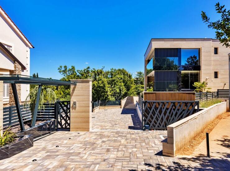 Ovu modernu i ekskluzivnu novogradnju karakterizira odličan raspored prostorija, ALU stolarija, kvalitetne sanitarije, parket, porculanska keramika, klimatizacija svih soba, podno grijanje, rimski kamen na ETICS fasadi, debljine 15 mm.