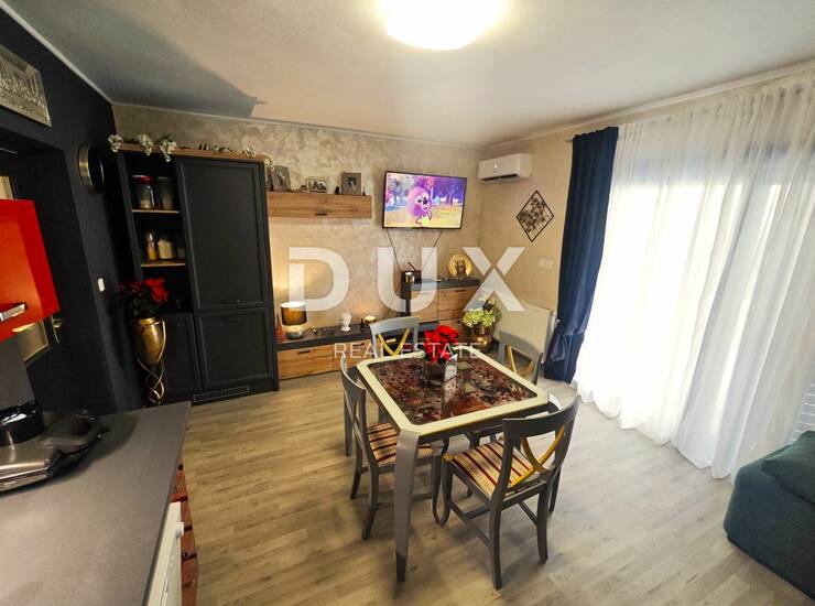 Apartman je novoadaptiran i sastoji se od dvije spavaće sobe, dnevnog boravka s kuhinjom i blagovaonicom, hodnika, kupatila i prostrane natkrivene terase. Apartmanu po etažnom elaboratu pripadaju dva parkirna mjesta, garaža i okućnica koja uključuje roštilj, vanjski kameni stol i vrt.