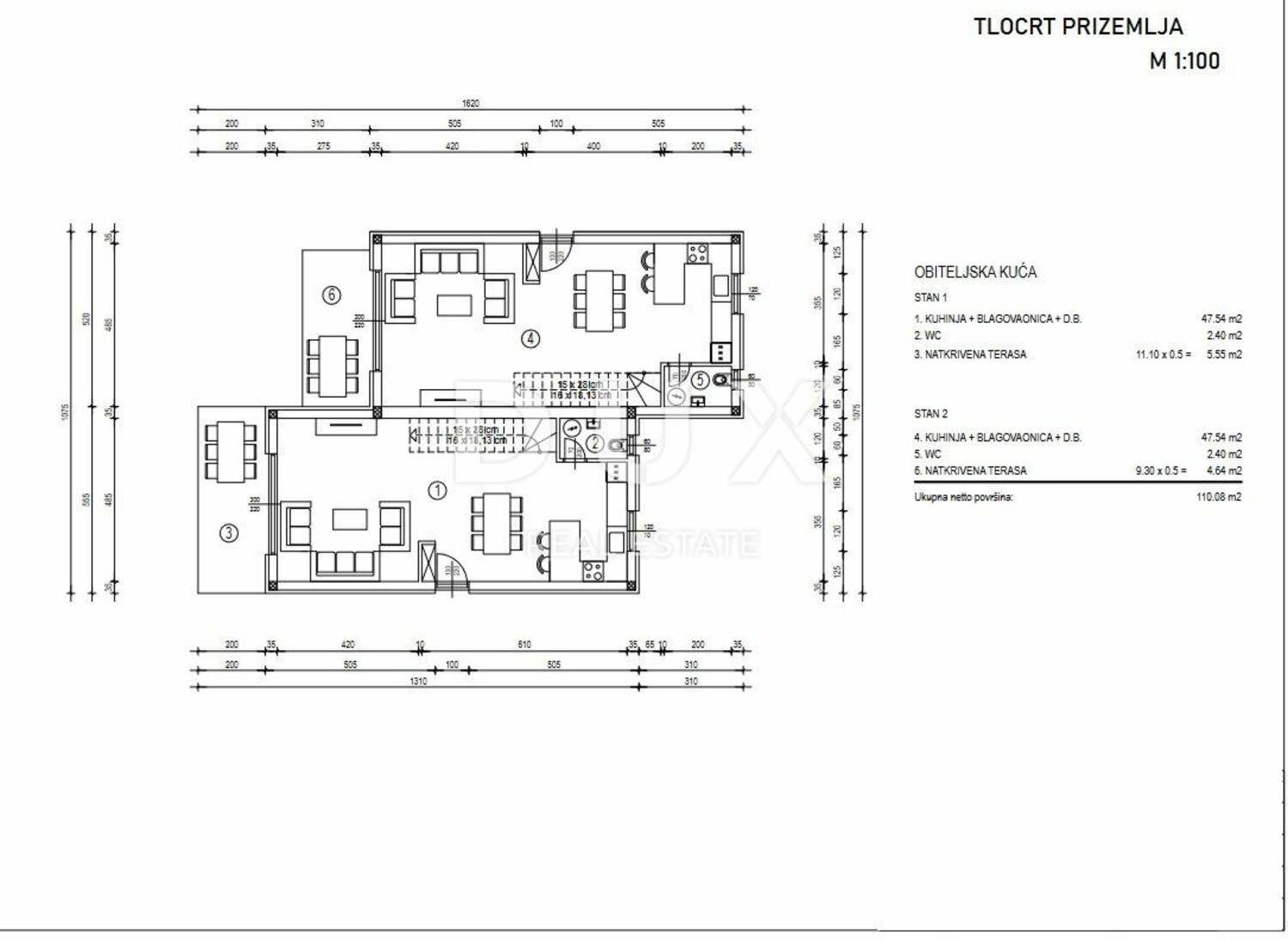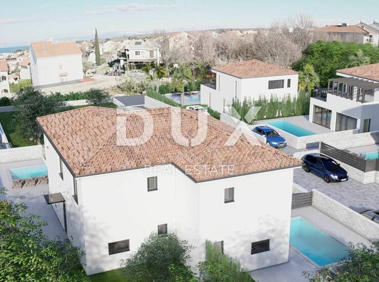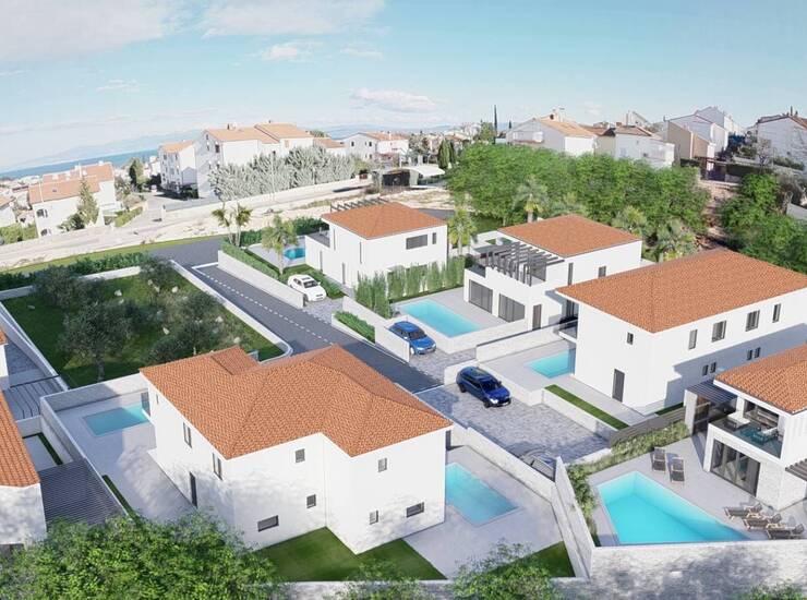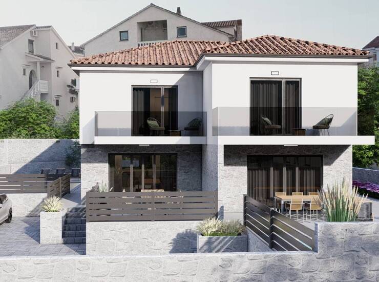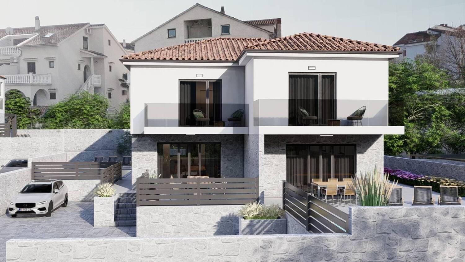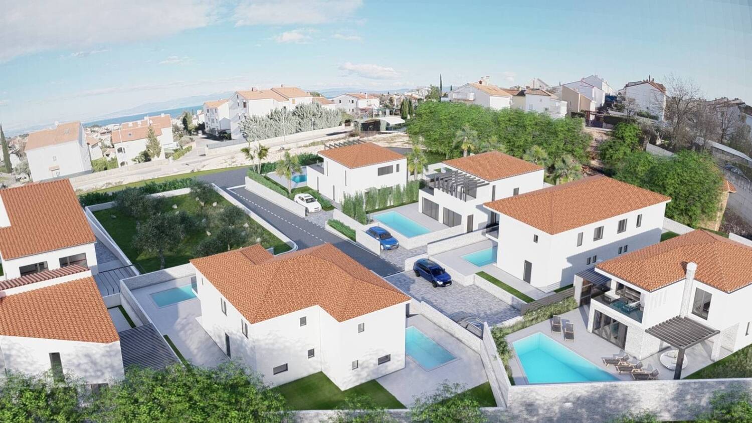 Parcela dolazi s gotovim idejnim projektom za izgradnju dvojne kuće, pri čemu svaka stambena jedinica ima vlastiti bazen, a po projektu prizemlje sadržava kuhinju, blagovaonicu, dnevni boravak, toalet i spremište, dok su na katu predviđene tri spavaće sobe, dvije kupaonice i terasa s otvorenim pogledom na more.