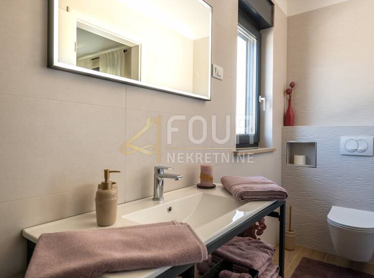 Prodaje se predivna vila, smještena u mirnom dijelu Krnice, svega 2,5 km od mora i s očaravajućim pogledom prema Krničkom portu i otoku Cresu. Ova elegantna kuća površine 129 m2 prostire se na dvije etaže i nalazi se na uređenoj parceli ukupne površine 884 m2, s prostranim dvorištem i bazenom od 34 m2 koji upotpunjuje doživljaj mediteranskog odmora.