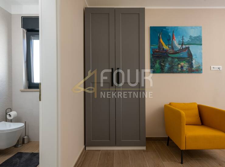 U prizemlju se nalaze prostrani dnevni boravak s kuhinjom i blagovaonicom, jedna spavaća soba s vlastitom kupaonicom te zaseban gostinjski toalet. Na katu su tri spavaće sobe, svaka s vlastitom kupaonicom i terasom – jedna od njih većom, s predivnim pogledom na more.