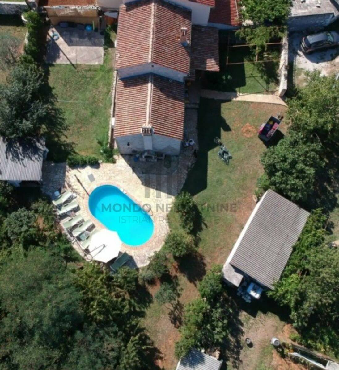 Lokacija: selo kod Marčane (vidjeti na Google Mapama). Tipična istarska kamena kuća je obnovljena 2010. godine s tri spavaće sobe (od kojih je jedna u galeriji s 4 kreveta), velikim dnevnim boravkom s SAT TV-om, 2 kupaonice, potpuno opremljenom kuhinjom i ugodnom blagovaonicom. Ispred kuće nalazi se natkrivena terasa za doručak, ručak ili večeru u prirodi. U ogromnom ograđenom vrtu na raspolaganju je bazen veličine 25 m2, chill-out terasa i roštilj. Također, vani su stabla jabuka, 2 kruške, 2 trešnje, marelica i šljiva. Postoji automatski sustav za navodnjavanje. Bazen se grije. Na raspolaganju su još perilica rublja, perilica posuđa, hladnjak s ledenicom, aparat za kavu, mikrovalna pećnica, smoothie maker, posteljina, ručnici, WiFi i klima. Grijanje na drva preko kamina i radijatora u svakoj sobi. Parkiralište je uz kuću. Naš vrt ima 670 m2, a sama kuća ima 110 m2. Naravno, postoji mogućnost proširenja kuće. Gotovo cijela kuća je izgrađena od prirodnih materijala (kamena, drva, željeza). Bazen je smješten na mjestu gdje je sunce cijeli dan u bazenskom području. Postoji mogućnost kupnje oko 3000 m2 zemljišta od susjeda. Kameni zidovi kuće su ručno izrađeni od strane majstora, bez korištenja opeke. Kuća se nalazi na istočnoj obali Istre, 6 km do mora ili 5 minuta vožnje autom. Tamo se nalazi i mali ribarski gradić, a ponekad postoji mogućnost postavljanja broda. Na ovoj strani plaže su potpuno prirodne, bez ugrađenih hotela
