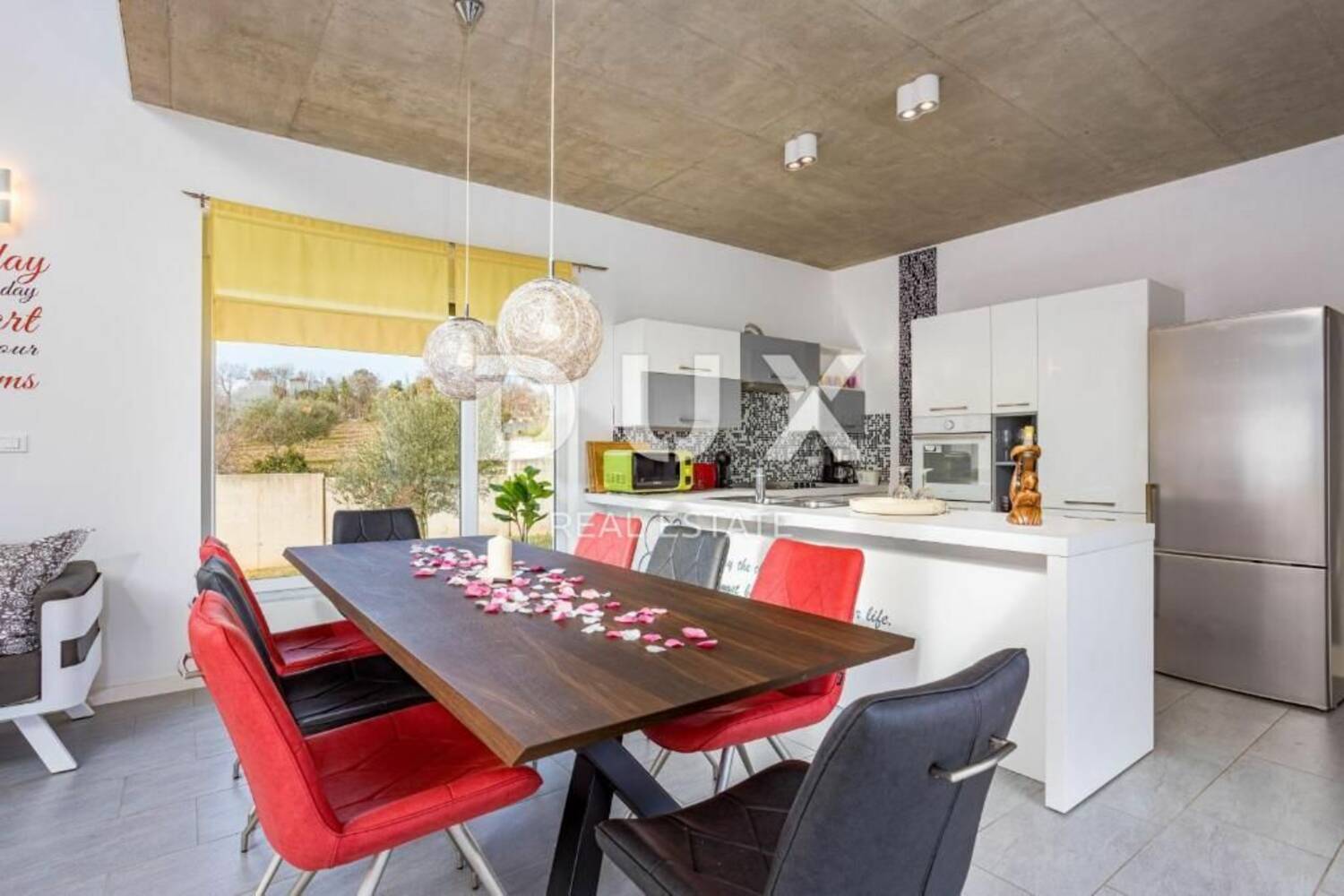 Ono što ovaj prostor čini posebnim jesu velike staklene stijene koje brišu granicu između unutarnjeg i vanjskog prostora, omogućujući obilje prirodne svjetlosti i direktan pristup natkrivenoj terasi, bazenu i uređenoj okućnici. Na terasi se nalazi i moderna ljetna kuhinja – savršena za druženja i opuštene večeri.