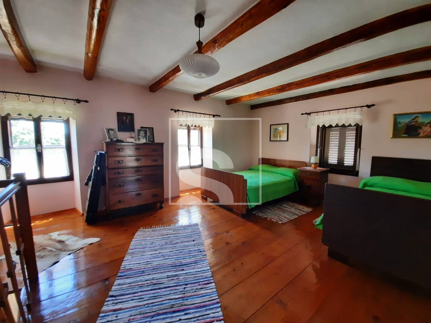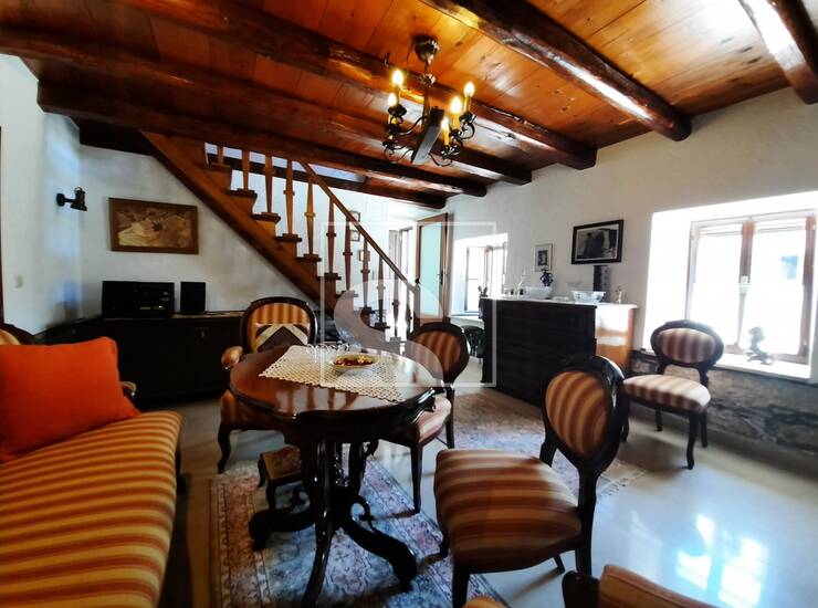 Nekretnina je organizirana kao dvije odvojene cjeline, što omogućuje korištenje za stanovanje više članova obitelji ili kombinaciju stanovanja i najma. Prva stambena jedinica sastoji se od hodnika, odvojenog dnevnog boravka s ognjištem odnosno kaminom te galerijskog prostora do kojeg vode drvene stepenice, gdje se nalazi prostrana spavaća soba. U prizemlju se dodatno nalaze kuhinja, još jedna spavaća soba i kupaonica. Iz ovog dijela kuće izlazi se na popločanu terasu s pogledom na vrt, dok je s druge strane omogućen izravan pristup garaži površine 38 m².