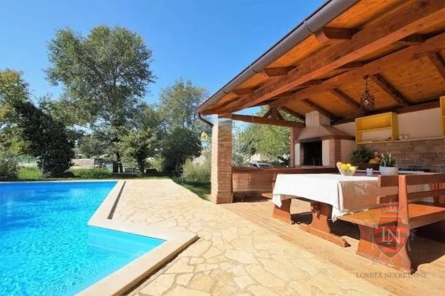 Okućnica je u potpunosti ograđena i održavana. Privući će vas atraktivan bazen veličine 34 m2, kao i natkrivena terasa s ljetnom kuhinjom i kaminom koja služi kao izvrsna lokacija za druženje i blagovanje, s pogledom na bazen i vrt.
