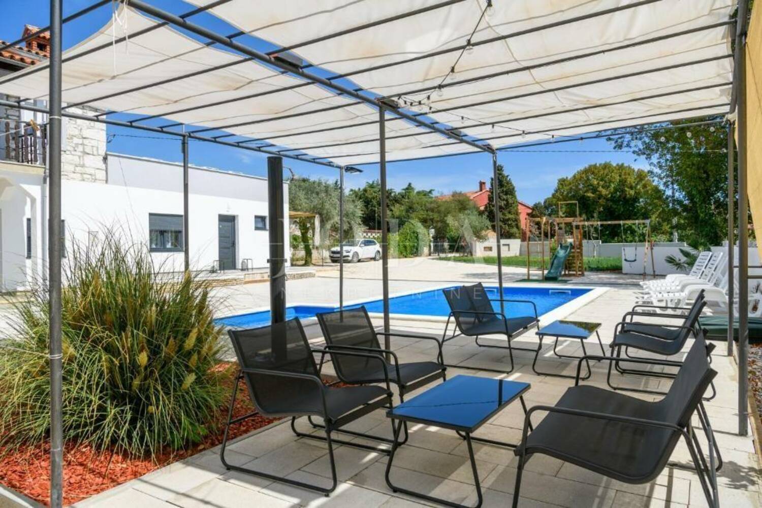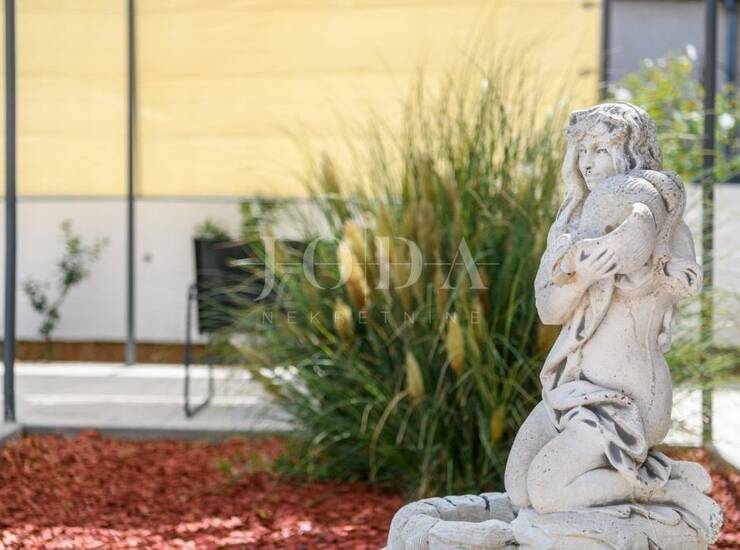 Na uređenoj okućnici nalazi se bazen sa sunčalištem, ljetna kuhinja sa blagovaonom, grill, dječje igralište, te građevinski teren od 900 četvornih metara, gdje postoji mogućnost zidanja još jedne kuće.