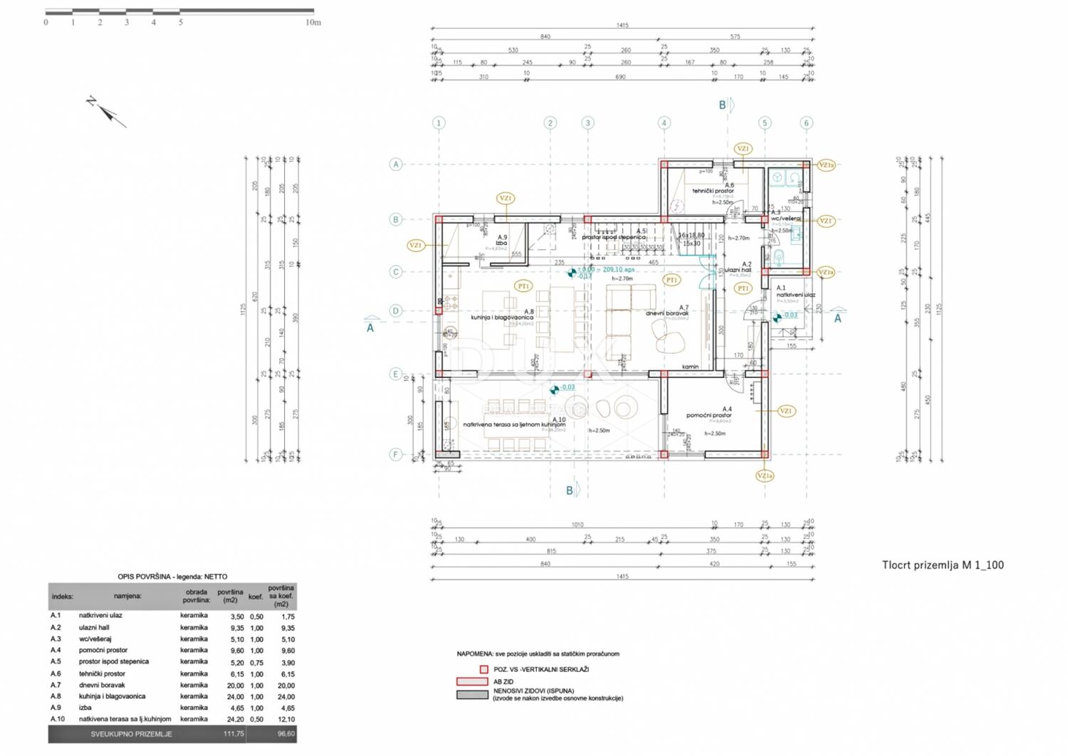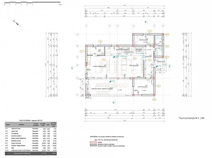 Prizemlje kuće sastoji se od prostora otvorenog koncepta koji ujedinjuje kuhinju, blagovaonicu i dnevni boravak s izlazom na natkrivenu terasu koj