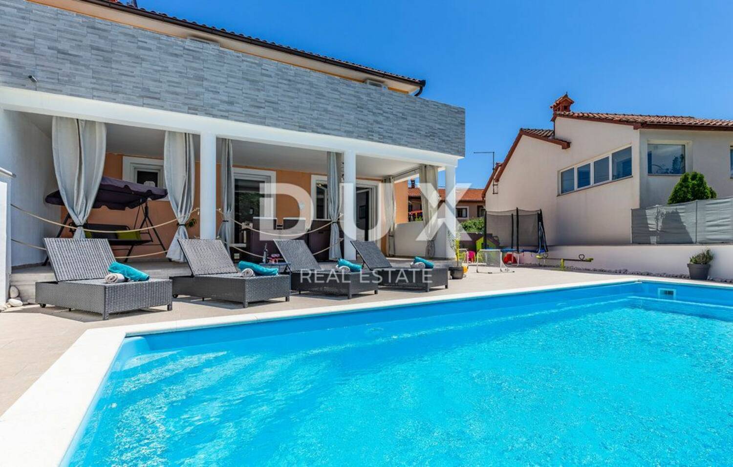 U prodaju smo dobili novouređenu kuću s bazenom. Radi se o dvojnom objektu, odnosno kuća je podijeljena na dva gotovo ista dijela. Kompletno odvojena i pregrađena zidom, daje potpunu privatnost novim vlasnicima dijela kuće.