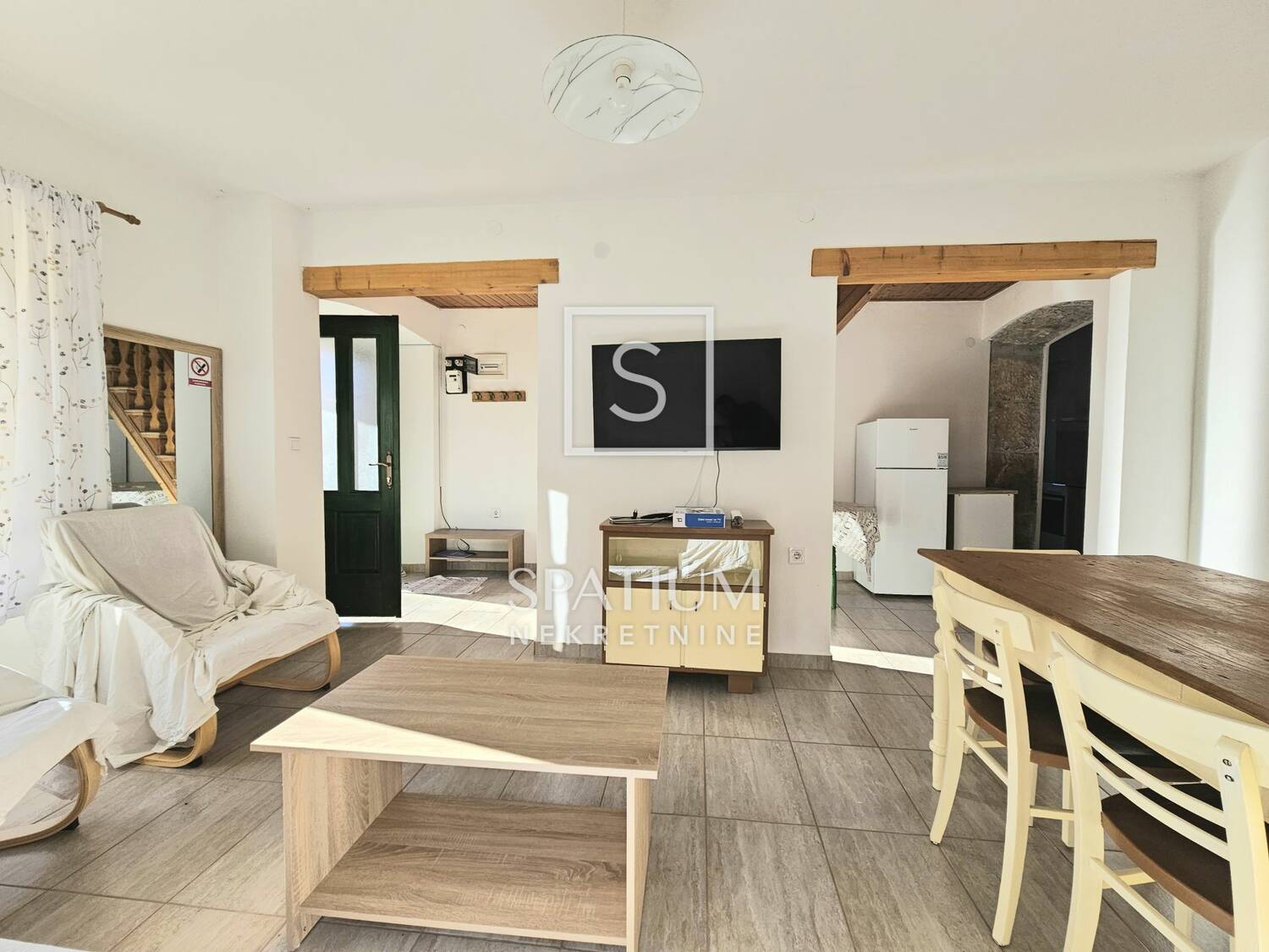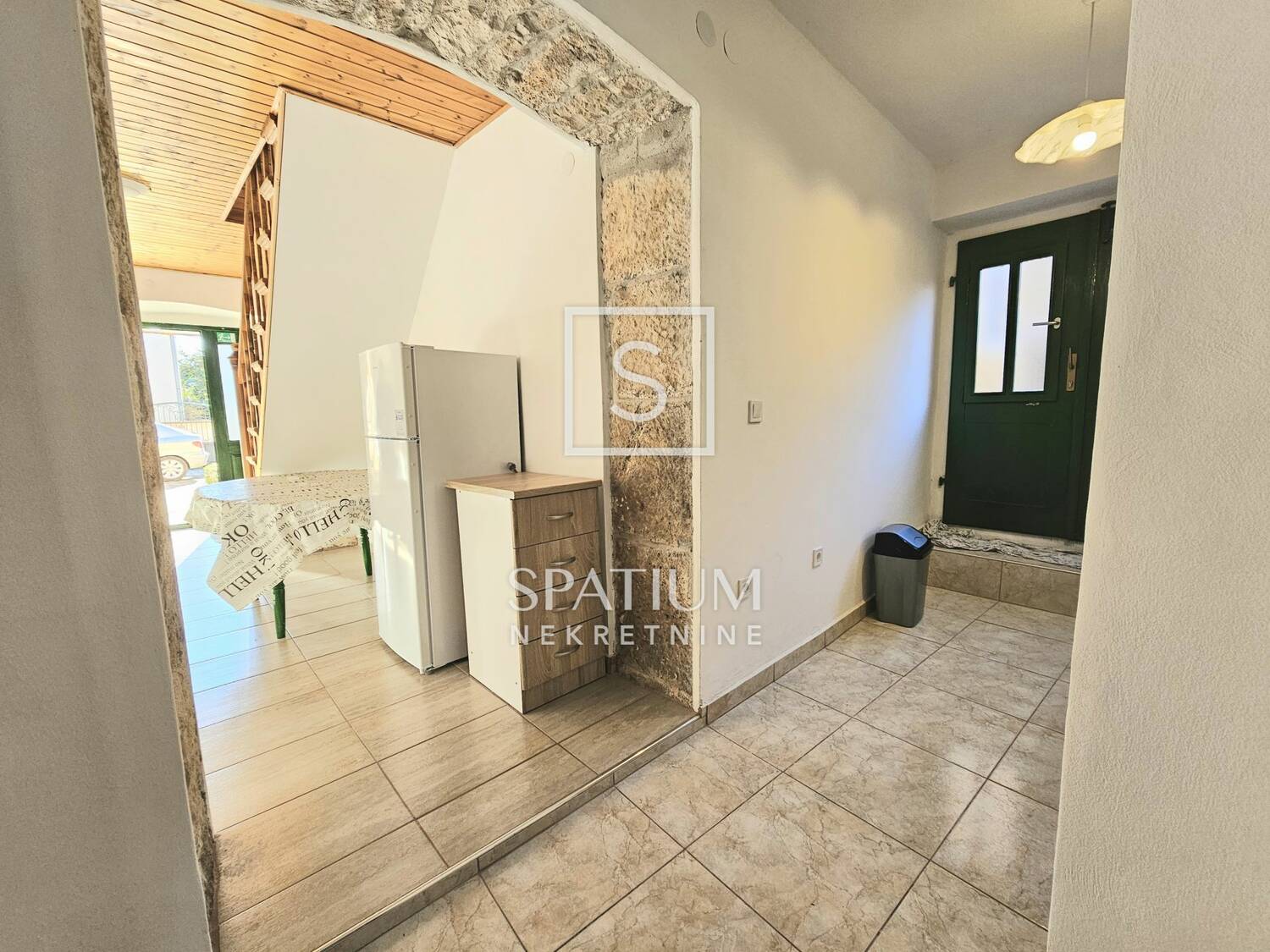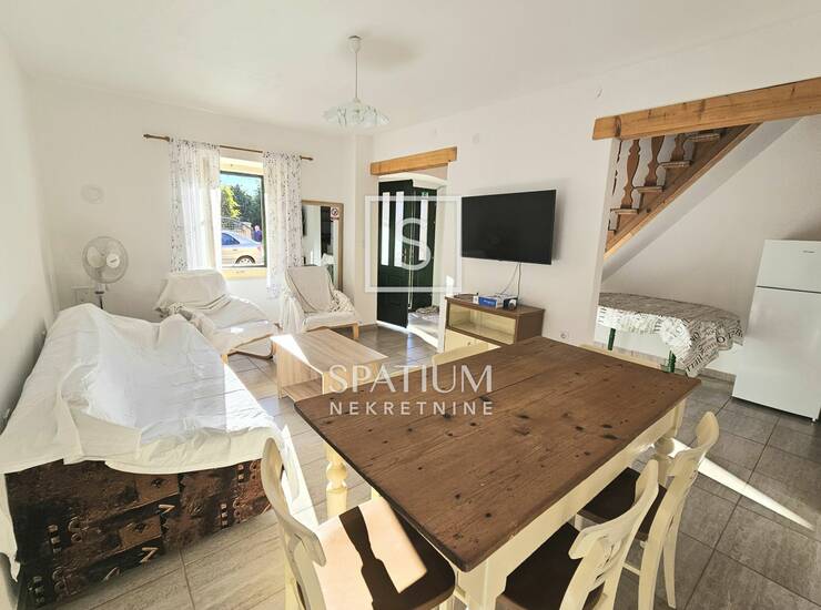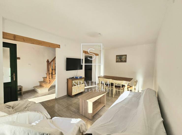 Na prizemnoj etaži nalazi se prostrani dnevni boravak s blagovaonom, jedna soba, kuhinja te kupaona. Stubište vodi na kat gdje se nalaze još tri spavaće sobe te još jedna wc. Sveukupno je 117,5m2 okućnice na kojoj se nalazi "šterna" (spremnik vode) uz uređeno dvorište i prostorom za druženje kao i uređeni parking za jedno vozilo.