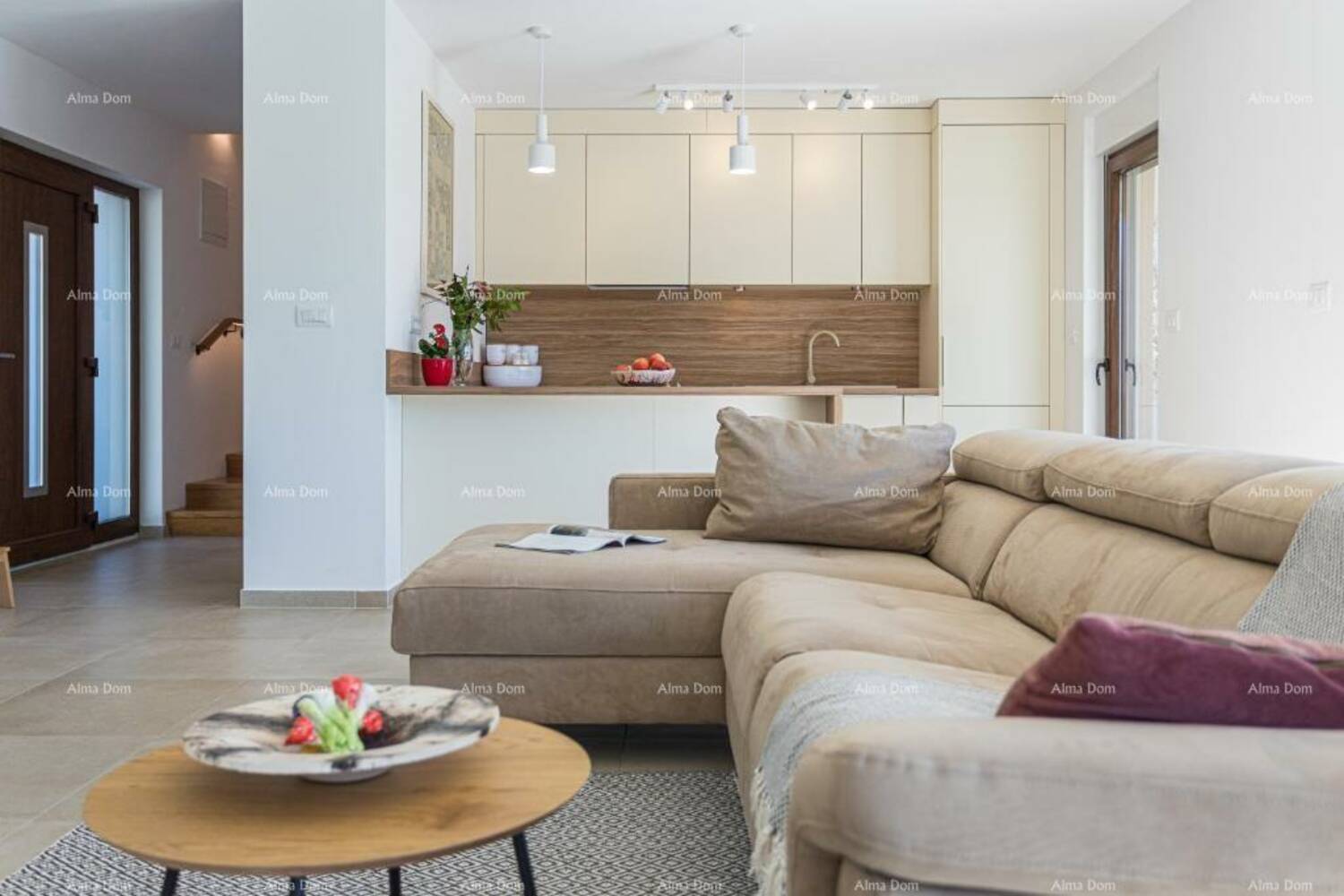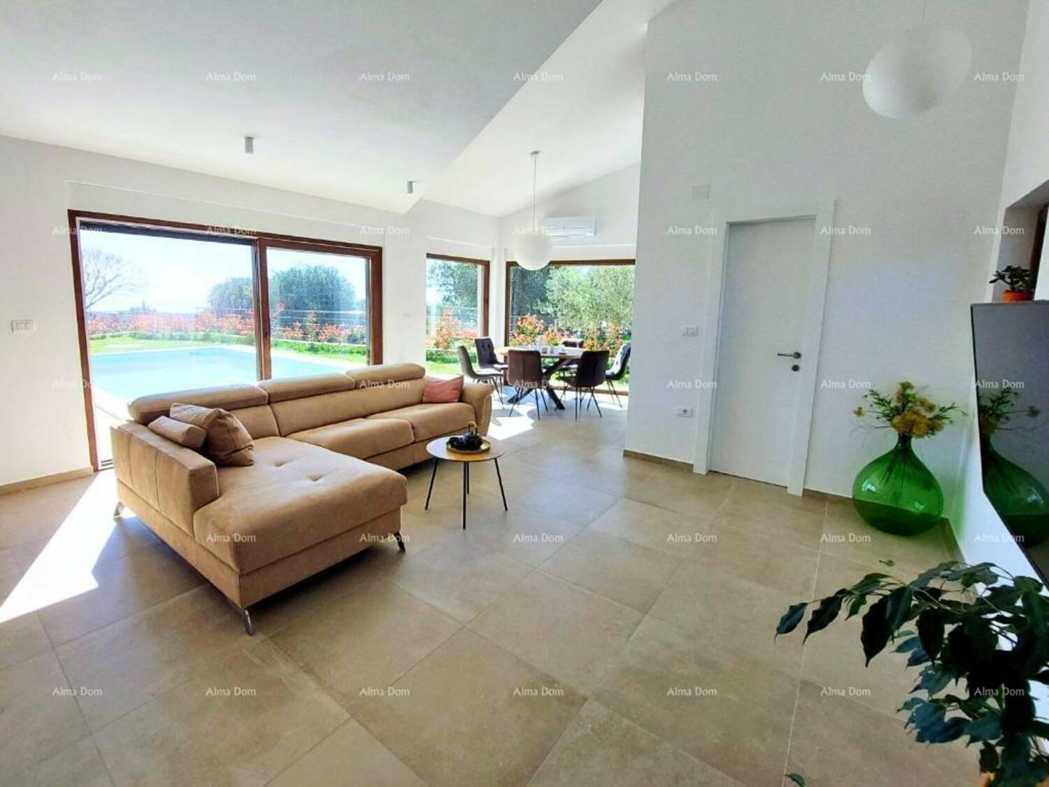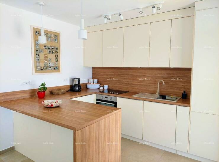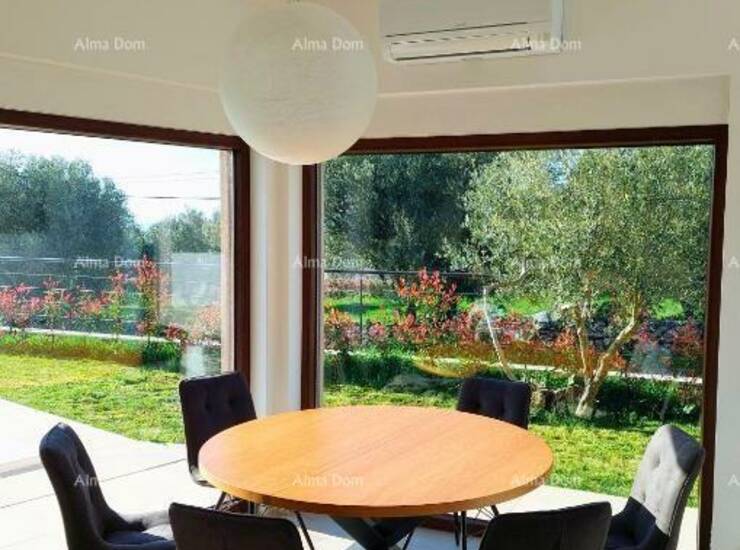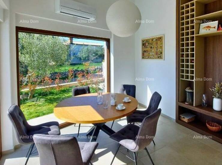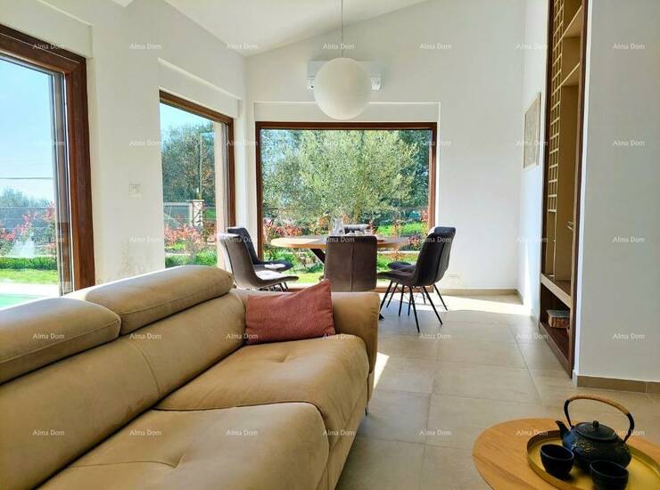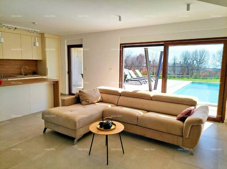Kuća se sastoji od open space prostora u prizemlju sa kuhinjom, blagovaonom, spavaca soba sa kupatilom, toaletom i dnevnim boravkom iz kog se izlazi na natkrivenu terasu sa roštiljem i vrt sa bazenom.