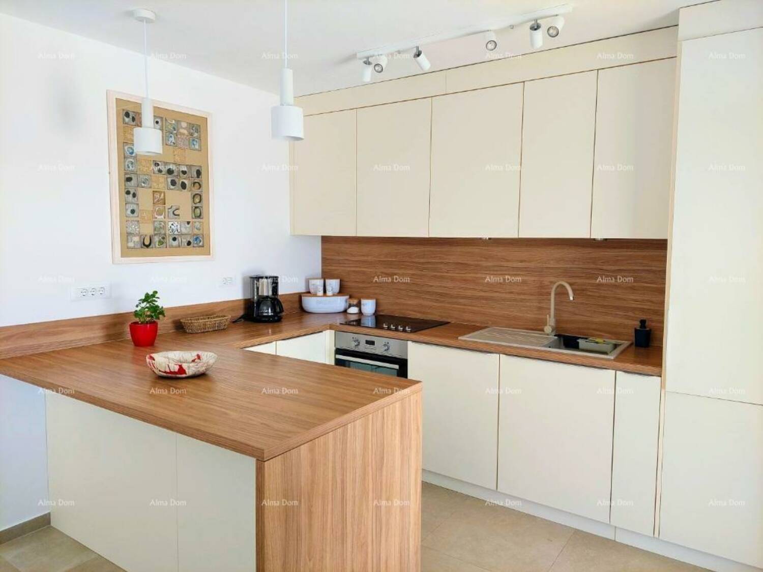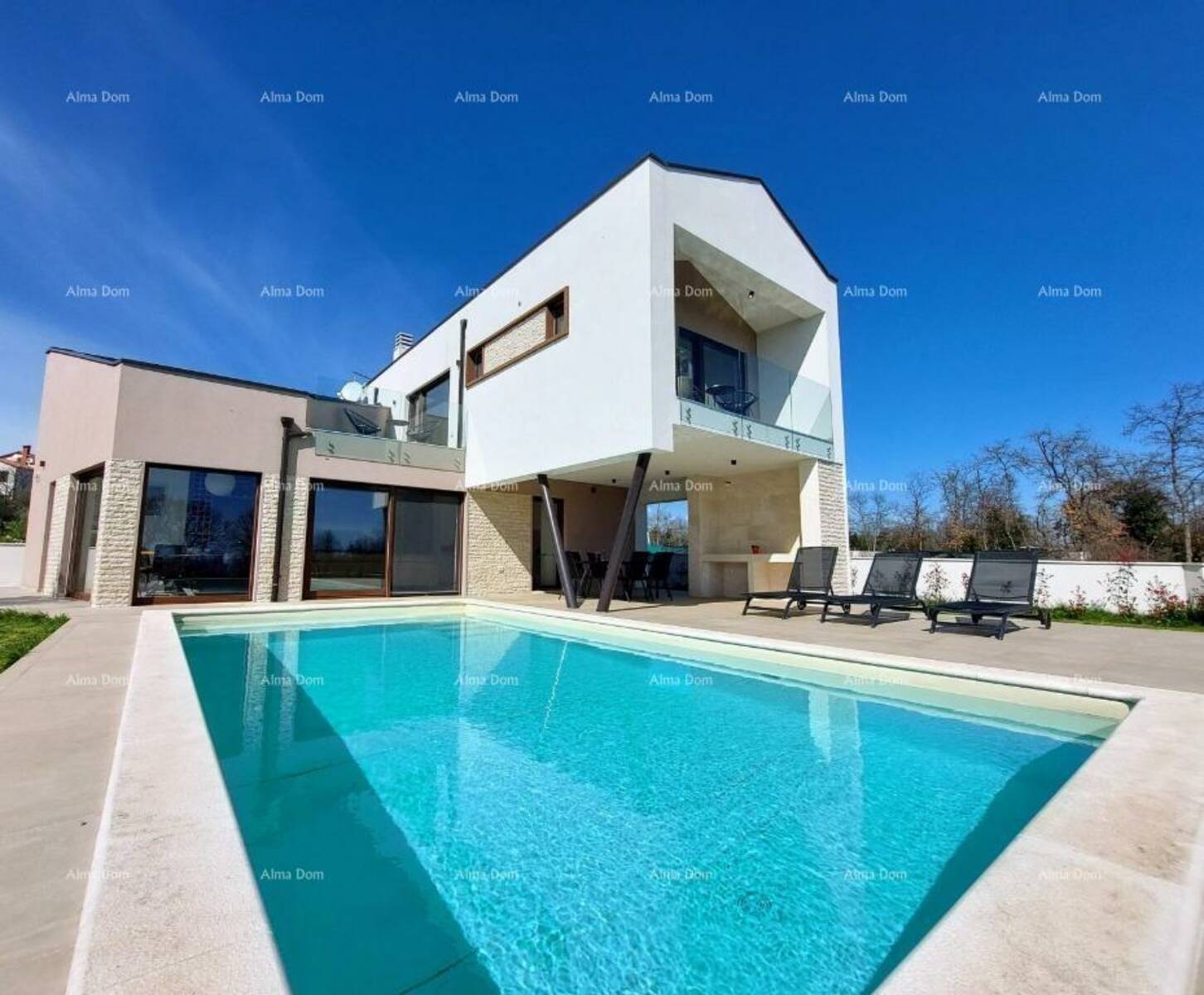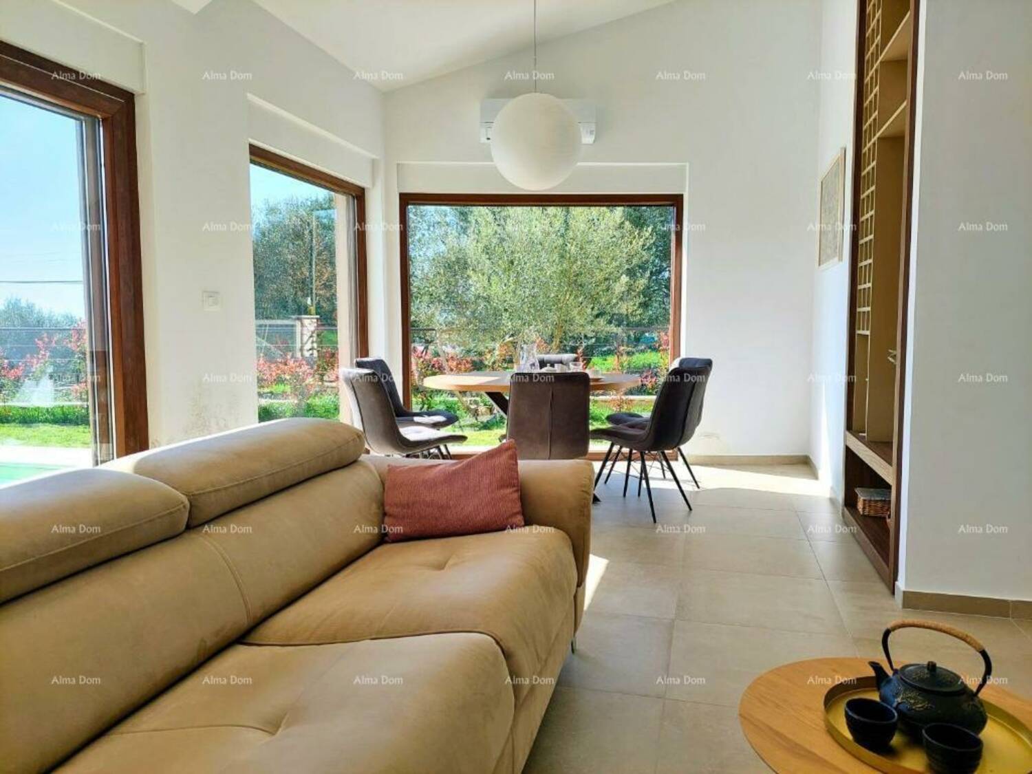 Kuća se sastoji od open space prostora u prizemlju sa kuhinjom, blagovaonom, spavaca soba sa kupatilom, toaletom i dnevnim boravkom iz kog se izlazi na natkrivenu terasu sa roštiljem i vrt sa bazenom.