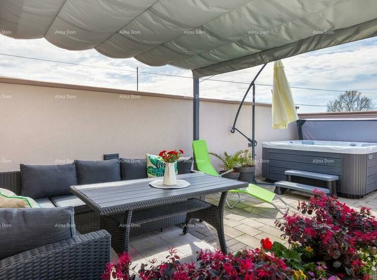 Unutarnje stepenice vode na polukat kuće gdje se nalazi prostrani dnevni boravak te terasom od cca 8 m2, još jednim unutarnjim stepenicama se ide na 1. kat kuće gdje se nalaze dvije spavaće sobe te kupaonica.