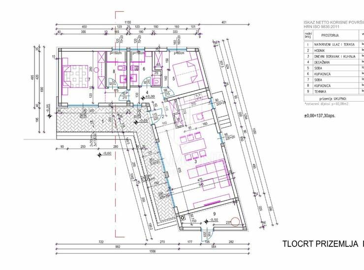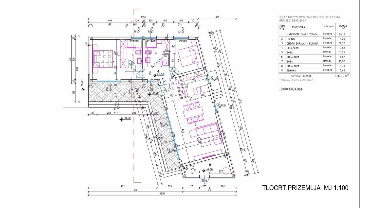Kuća je koncipirana tako da se od ulaza na lijevoj strani smjestio spavaći dio sa dvije sobe i dvije kupaonice dok je sa desne strane kuhinja , dnevni boravak i blagovaonica u otvorenom modernom stilu. Iz njih se izlazi prema natkrivenoj terasi te bazenu sa sunčalištem. Moderna i odlično raspoređena, pruža ugodu i suvremen izgled.